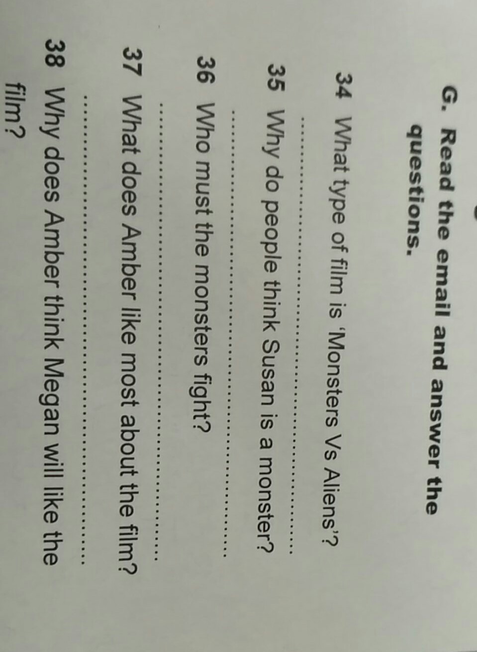 O 34 Какой фильм «Монстры против пришельцев»? 35 Почему люди думают, что Сьюзан - это монстр? 36 Кто должен сражаться монстрам? 37 Что такое Амбер больше всего нравится в фильме? 38 Почему Амбер думает, что Меган понравится фильм ?