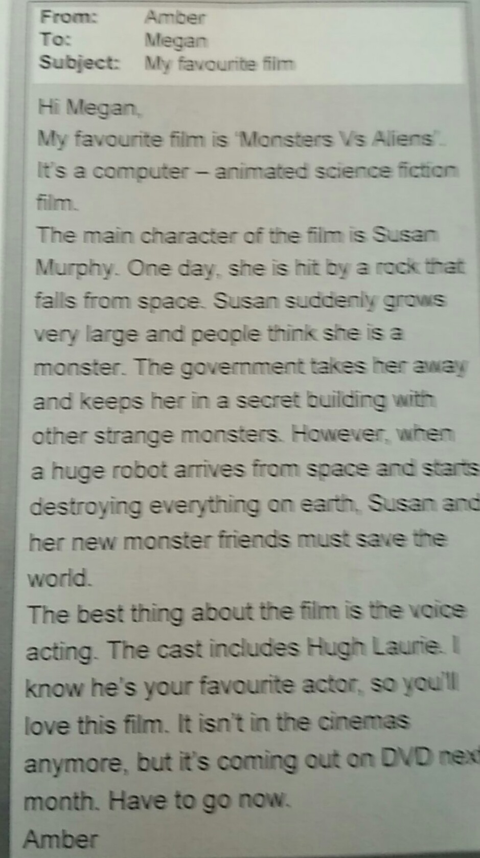 Привет, Меган, Мой любимый фильм - Monsters Vs Aliens. Это компьютерная анимационная фантастика. Главным героем фильма является Сьюзан Мерфи. Однажды ее поражает скала, которая падает из космоса. Сьюзан внезапно становится очень большой, и люди думают, что она монстр. Правительство забирает ее и держит в секретном здании с другими странными монстрами. Однако, когда огромный робот прибывает из космоса, а звезды разрушают все на земле, полагают, что ее новые друзья-монстры должны спасти мир. Лучше всего в фильме - голос. В актерском составе Хью Лори. Я знаю, что он ваш фаво-актер, поэтому ты