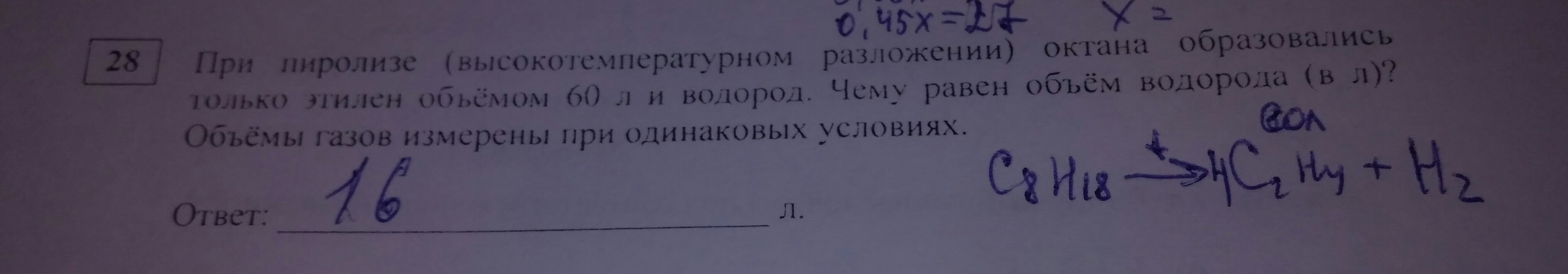 При пиролизе октана образовались только этилен объемом 60л и водород. Чему равен объем водорода ?