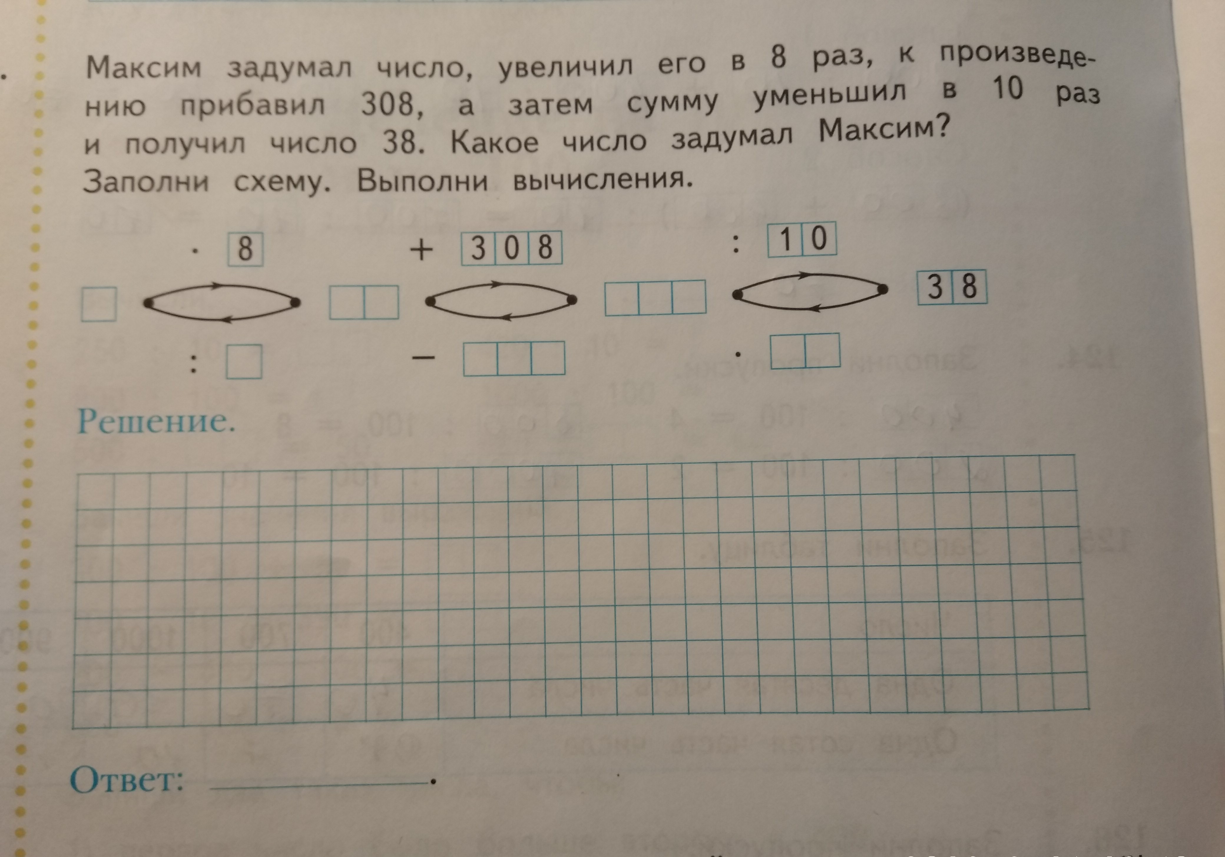 1. Уменьшил в 10 раз и получил число 38, на оборот увеличил в десять раз. 38*10=380 2. К произведению прибавил 308, а значит отнял. 380-308=72 3. Максим задумал число, увеличил его в 8 раз, а значит уменьшил в восемь раз. 72/8=9 Проверка: 9*8=72 72+308=380 380/10=38 Ответ: Максим задумал число 9