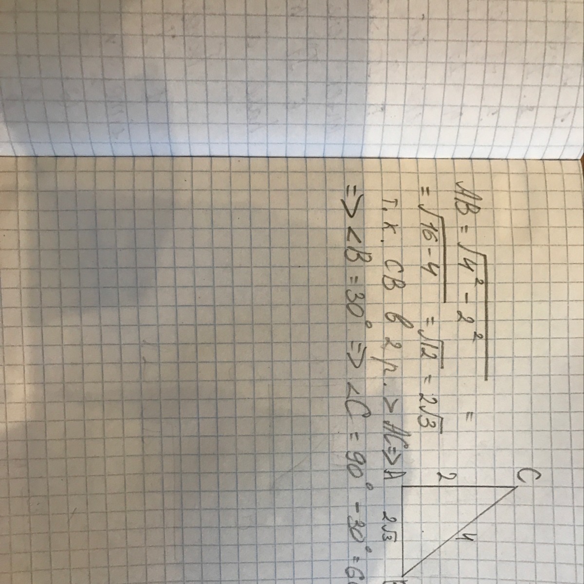 Сначала находим катет по теореме Пифагора. Так как сторона, лежащая против угла в 30 градусов, равна половине гипотенузы, угол В равен 30 градусов, а С 60 гр.
