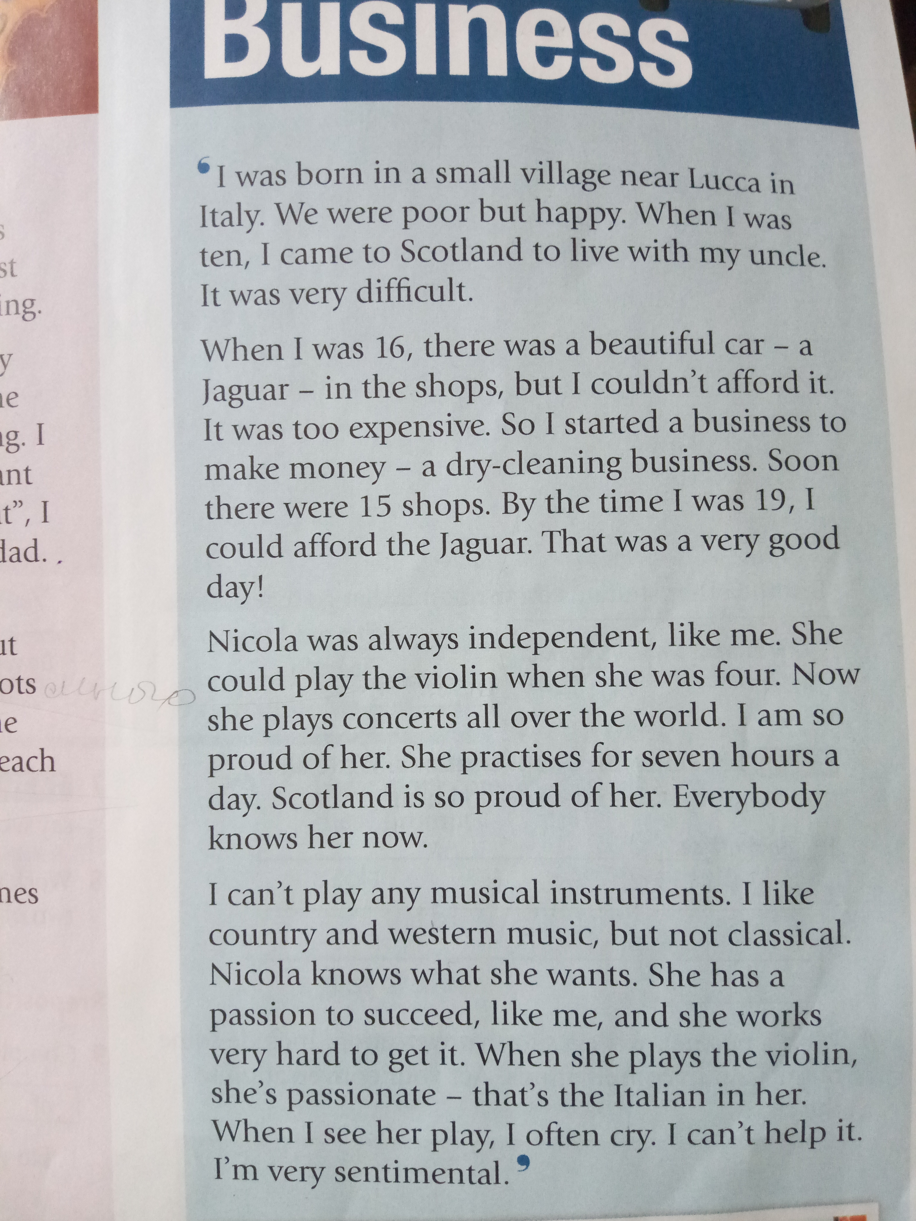 MTS RUS .ill 24% O 19:19 Бизнес Я родился в маленькой деревушке недалеко от Лукки в Италии. Мы были бедны, но были счастливы. Когда мне было десять, я приехал в Шотландию, чтобы жить с моим дядей. Было очень трудно. Когда мне было 16 лет, в магазинах был красивый автомобиль - «Ягуар», но я не мог себе этого позволить. Это было слишком дорого. Поэтому я начал бизнес, чтобы зарабатывать деньги на химчистку. Вскоре было 15 магазинов. К тому времени, когда мне было 19, я мог позволить себе Jaguar. Это был очень хороший день! г. муравейник. Никола всегда была независимой, как и я. Она могла играть на скрипке, когда ей было четыре года. Сейчас она играет на концертах по всему миру. Я так горжусь ею. Она практикуется семь часов в день. Шотландия так гордится ею. Теперь ее все знают. Каждый из них не может играть на каких-либо музыкальных инструментах. Мне нравится кантри и западная музыка, но не классическая. Никола знает, чего хочет. У нее есть страсть к успеху, как и я, и она очень много работает, чтобы ее получить. Когда она играет на скрипке, она страстная - это итальянец в ней. Когда я вижу ее игру, я часто плачу. Я не могу с этим поделать. Я очень сентиментальный 3AKPblTb