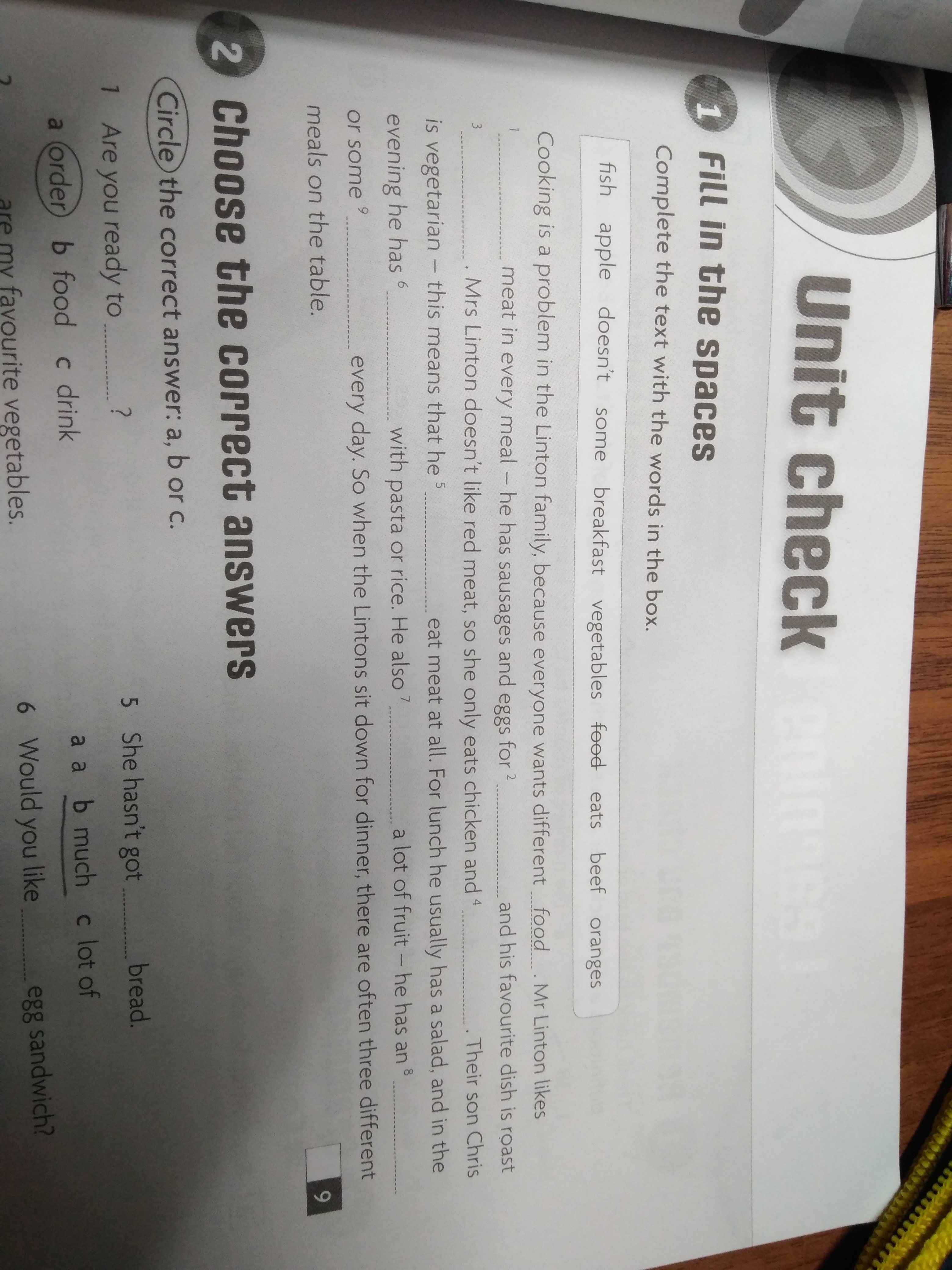1. some, 2. breakfast. 3. beef 4. fish 5. doesn't 6. vegetables 7. eats 8 apple 9 oranges