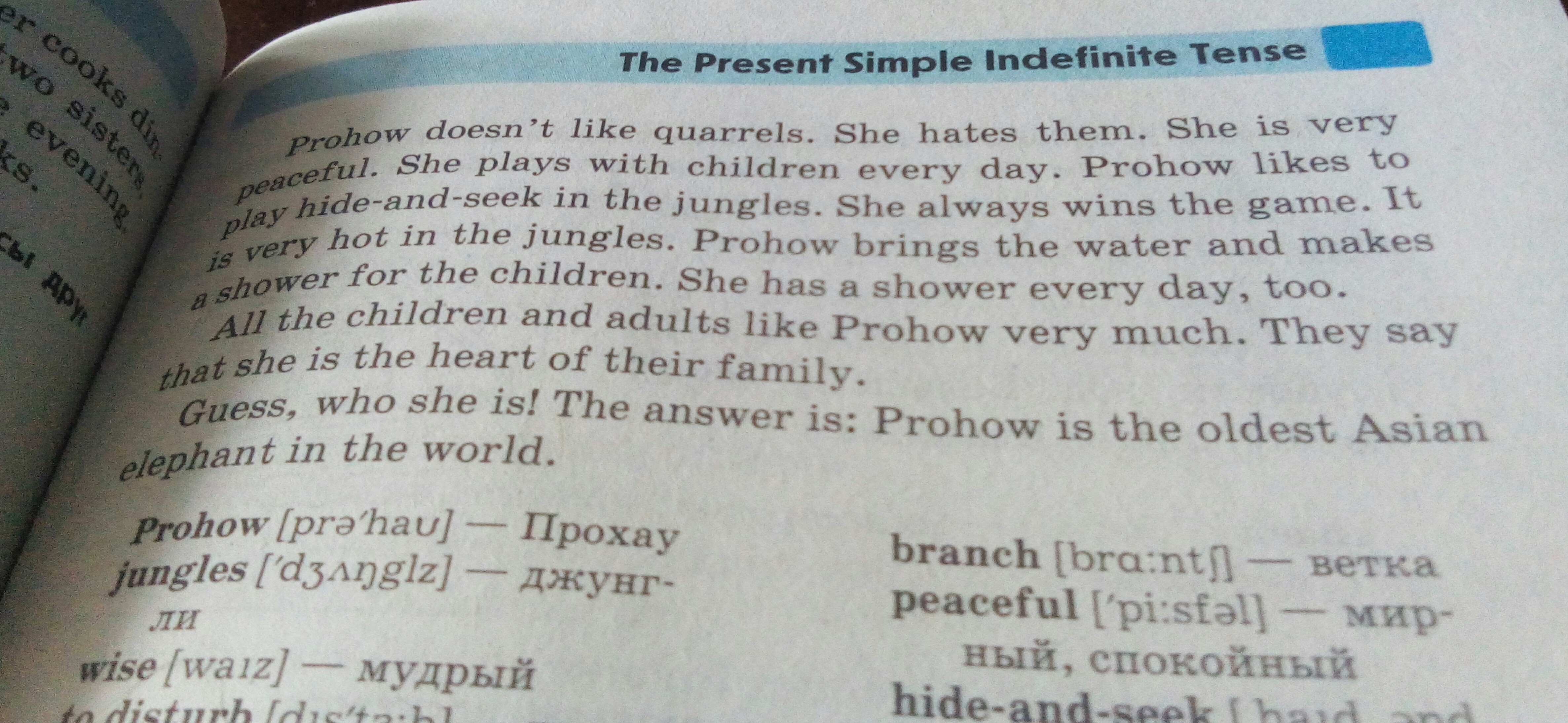 прохау(?) не любит ссоры. он ненавидит их. она очень миролюбивая. она играет с детьми каждый день. прохау любит играть в прятки в джунглях. она всегда выигрывает эту игру. в джунглях очень жарко. прохау приносит воду и делает душ для детей. она также принимает душ каждый день. все взрослые и дети очень любят прохау. они говорят, что она сердце их семьи. угадайте, кто она? вот и ответ : прохау - старейший азиатский слон в мире!