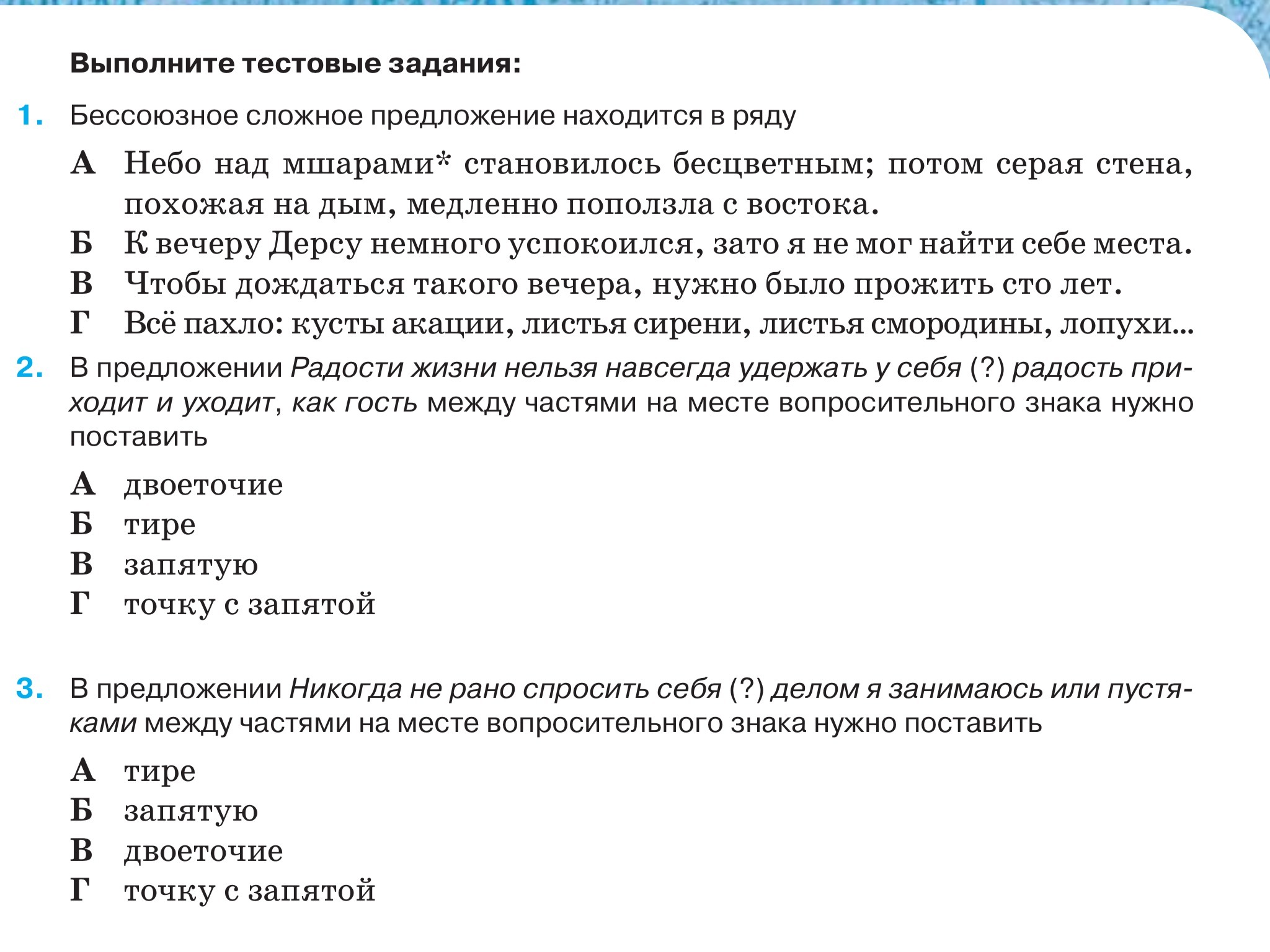 1-небо над мшарами (а),2- запятую (в),3-г-точку с запятой