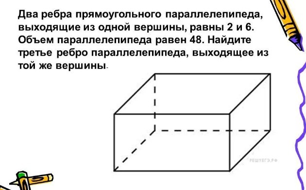 два ребра прямоугольного параллелепипеда, выходящие из одной вершины, равны 2 и 6. объём параллелепипеда равен 48. найдите третье ребро параллелепипеда, выходящее из той же вершины.