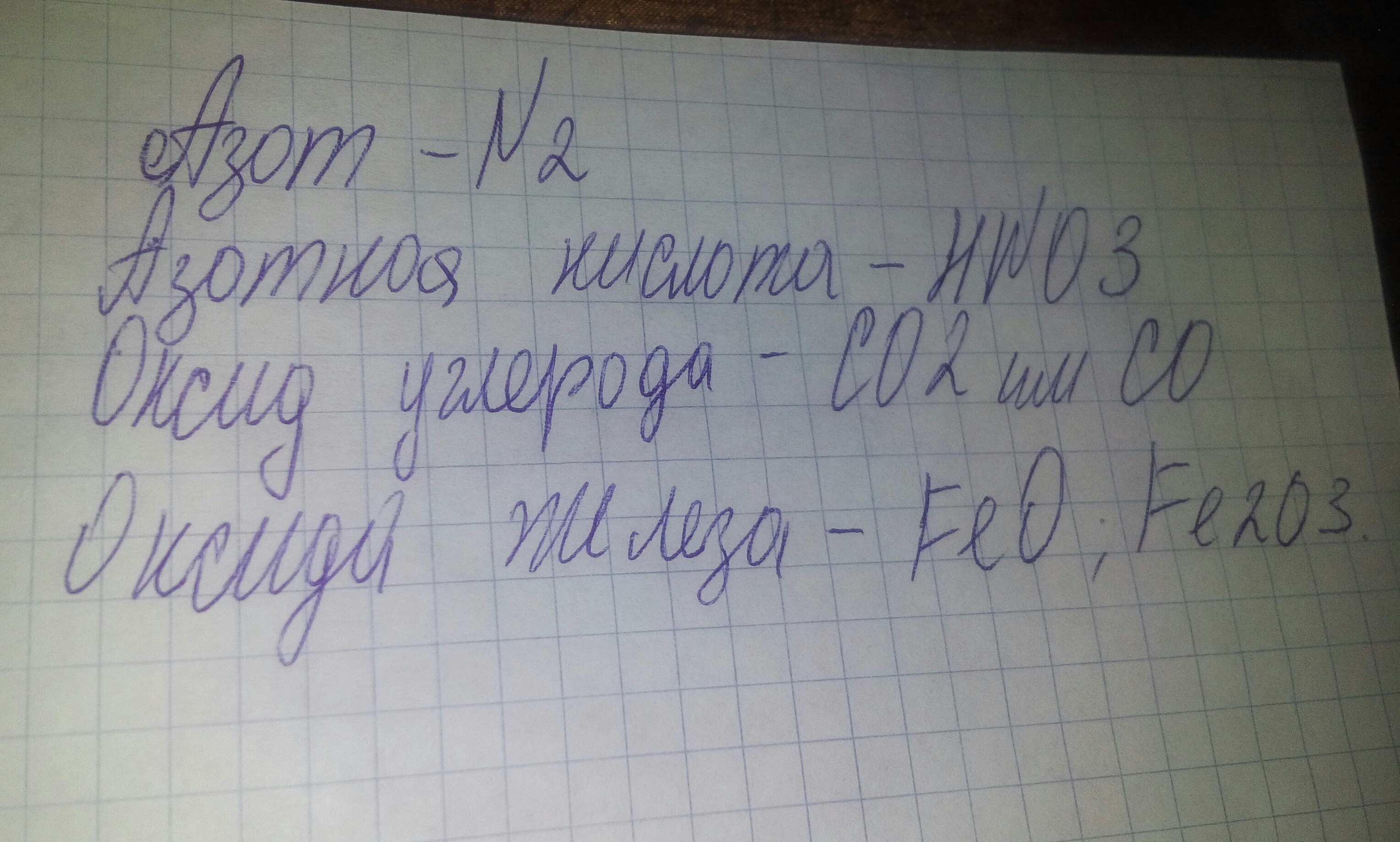 химические формулы следующих элементов : азота, азотной кислоты, оксида кислорода (lV), оксида железа (lll) помогите пожалуйста(((