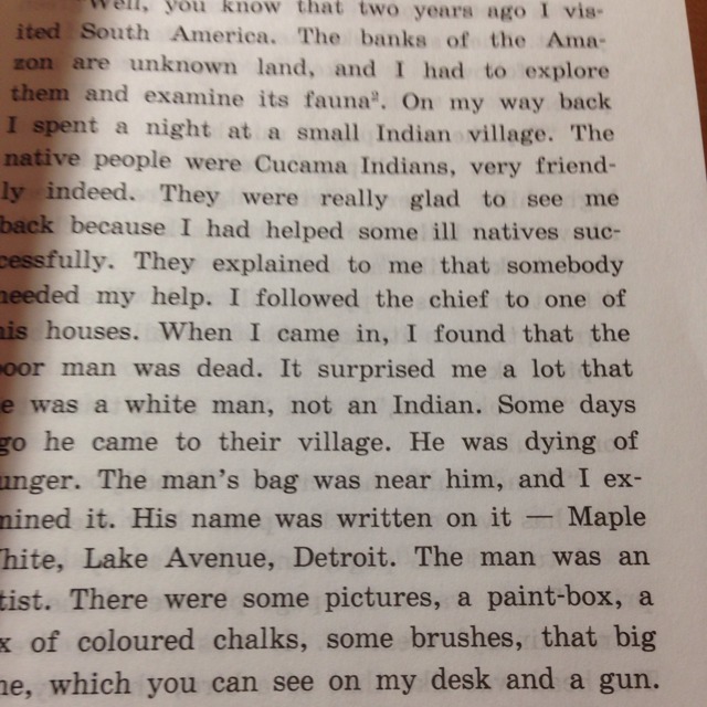 расположен в Южной Америке. Берега Ама-Рона-неизвестные земли, и мне пришлось исследовать их и исследовать их фауну. На обратном пути я провел ночь в маленькой индийской деревне. Родные люди Cucama индейцев, очень дружелюбны действительно. Они были очень рады меня видеть, потому что я помог некоторым больным туземцам подать в суд. Мне объяснили, что кому - то нужна моя помощь. последовал к одному из домиков. Когда я вошел, я обнаружил, что тот или иной человек мертв. Это очень удивило, что е был белым человеком, а не Индийцем. Несколько дней он пришел в их деревню. Он умирал от ингер. Сумка мужчины была рядом с ним, и бывший заминировал ее. Его имя было написано на нем Maple _hite, Lake Avenue, Detroit. Этот человек был истом. Там было несколько фотографий, коробка с краской, цветные мелки, кисти, большой Ле, который Вы можете увидеть на моем столе и пистолет.