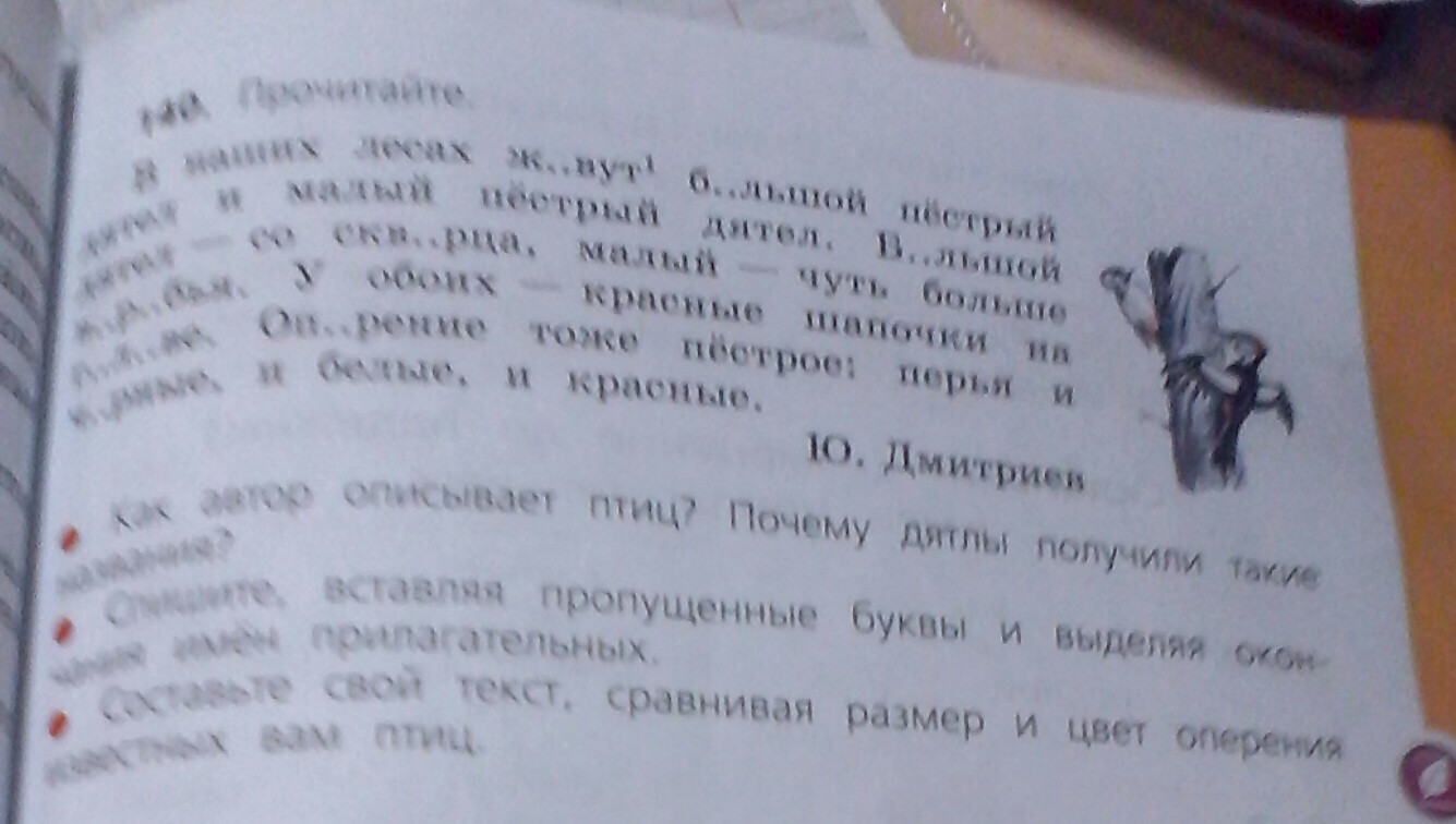 В нашИХ лесах живут большОЙ пестрЫЙ дятел и малЫЙ пестрЫЙ дятел. БольшОЙ дятел - размером со скворца, малЫЙ - чуть больше воробья. У обоих - краснЫЕ шапочки на голове. Оперение тоже пестрОЕ: перья и чернЫЕ, и белЫЕ, и краснЫЕ. Большие буквы это окончания прилагательных.