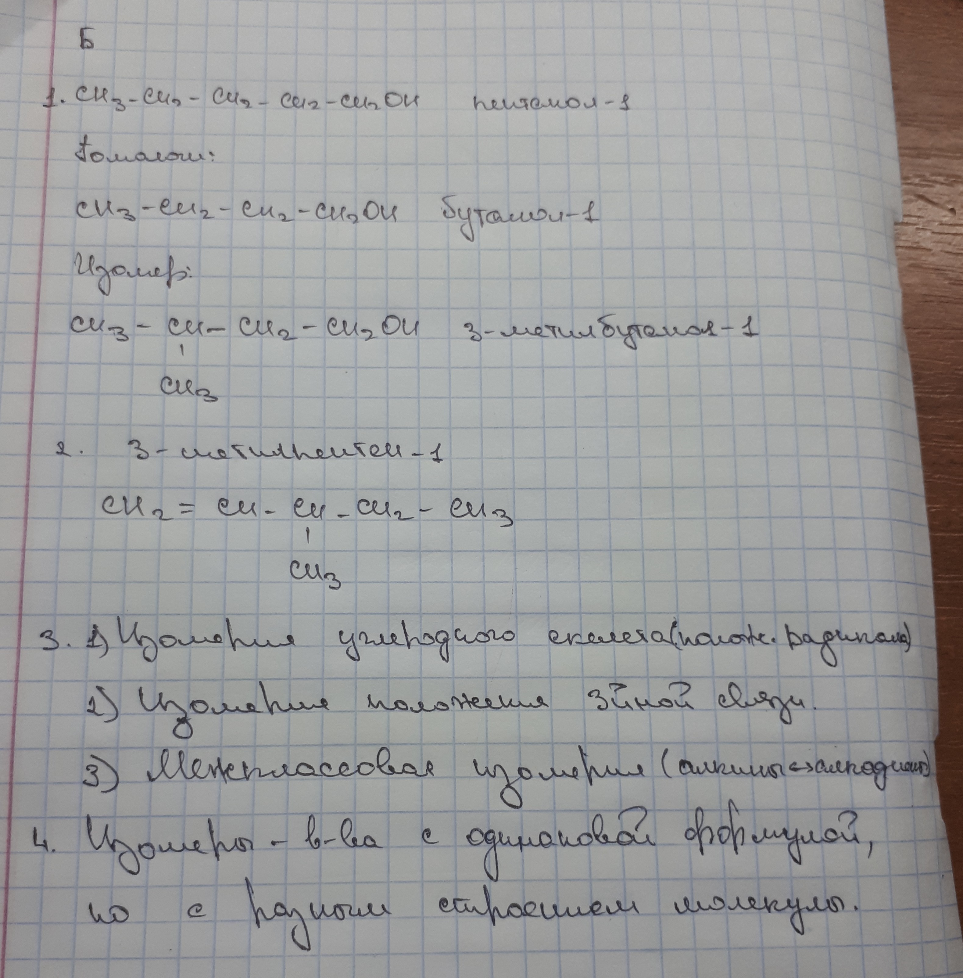 ЧАСТЬ Б. Задания со свободным ответом (10 баллов). Для вещества формула которого СН3 – СН2 – СН2 – СН2 – СН2ОН, составьте структурные формулы одного гомолога и одного изомера. Назовите все вещества. (4 балла). Составьте структурную формулу 3-метилпентена-1. (6 баллов). Перечислите виды изомерии, характерные для алкинов. (2 балла). Допишите фразу: «Изомеры – это вещества …».