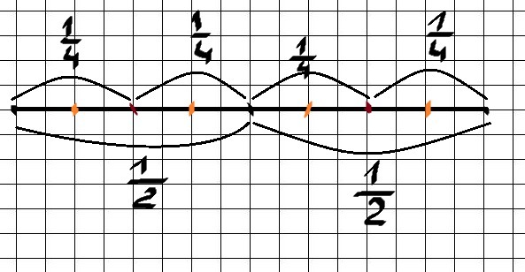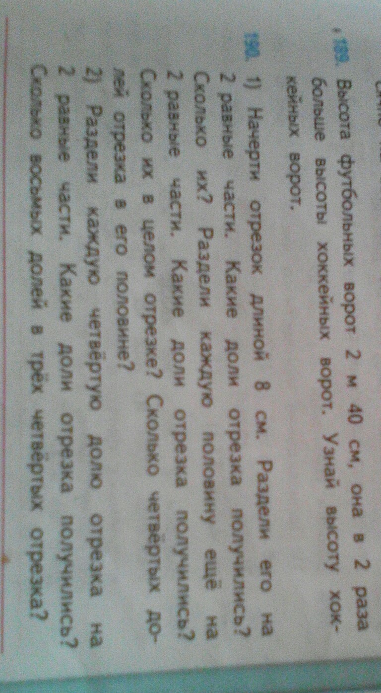 1) начертили 8 см. разделили на 2 отрезка по 4 см. получили две доли по одной второй части отрезка(половина отрезка). Разделили каждую половину еще на 2 отрезка по 2 см. получились четверти. в целом отрезке 2 половины и 4 четверти. в половине две четверти.