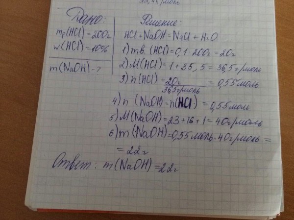 Вычислите массу гидроксида натрия, которая необходима для полной нейтрализации 200г 10% раствора соляной кислоты