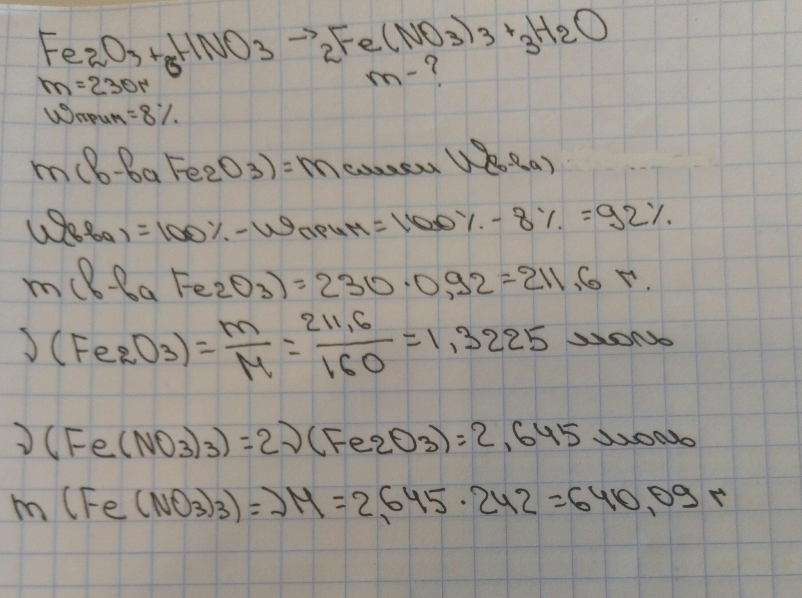 к 230 г оксида железа (3) с массовой долей примесей 8% добавили раствор азотной кислоты вычислите массу образовавшейся соли