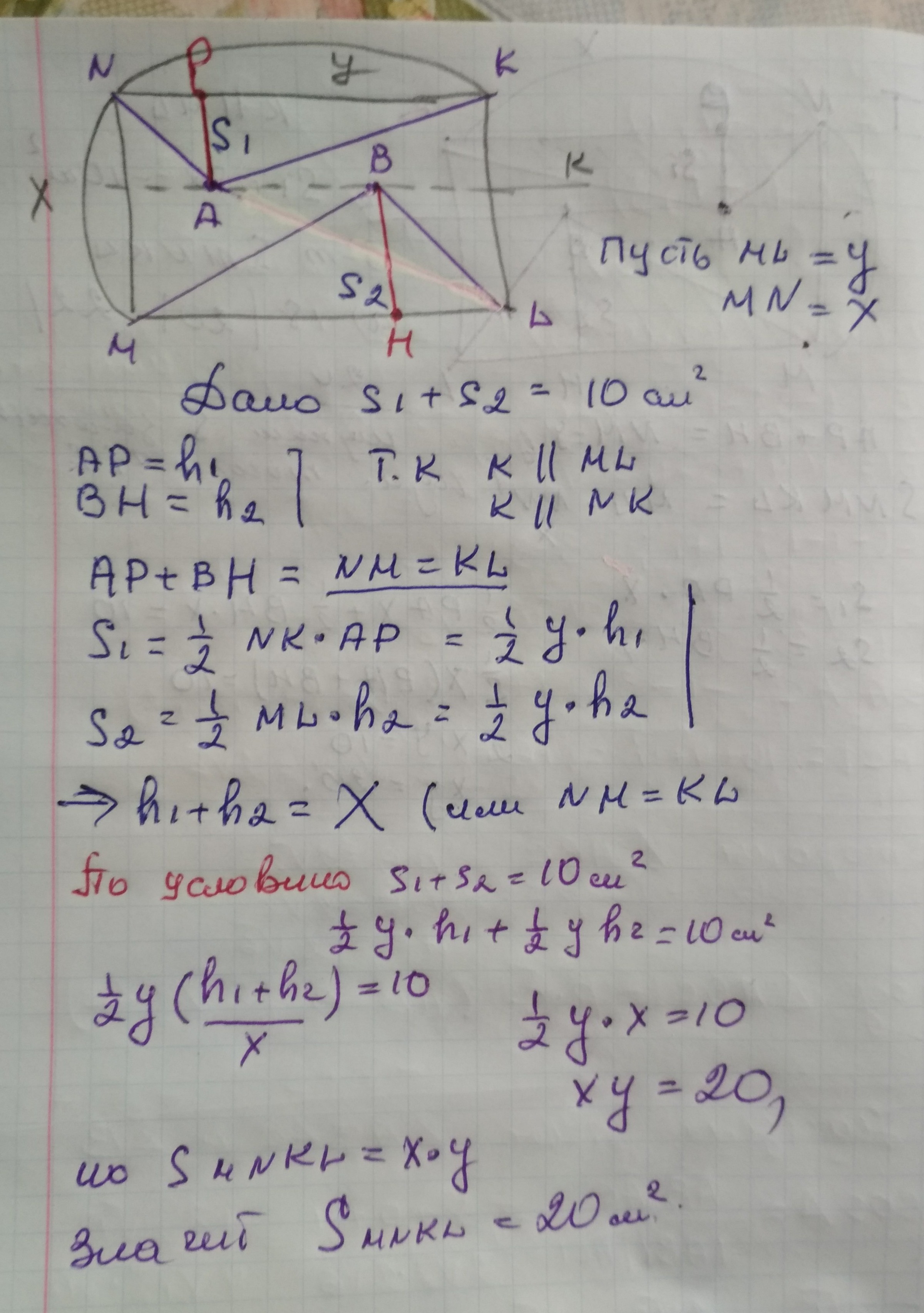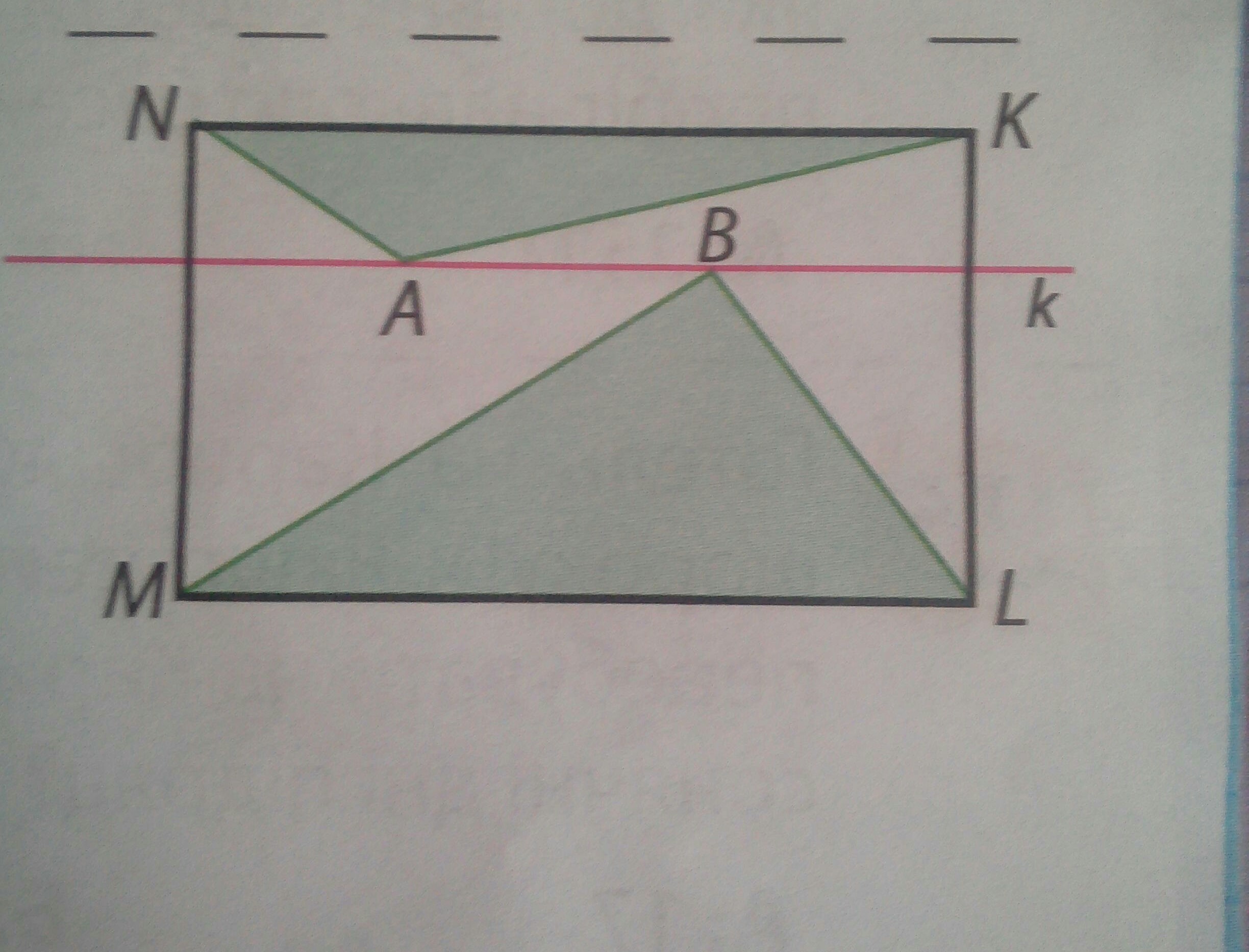 на малюнку справа прямокутник MNKL і пряма k, паралельна його стороні. дві точки A i B лежить на прямій k всередині прямокутника. сума площ двох зафарбованих трикутників дорівнює 10см2. чому дорівнює площа прямокутника MNKL.