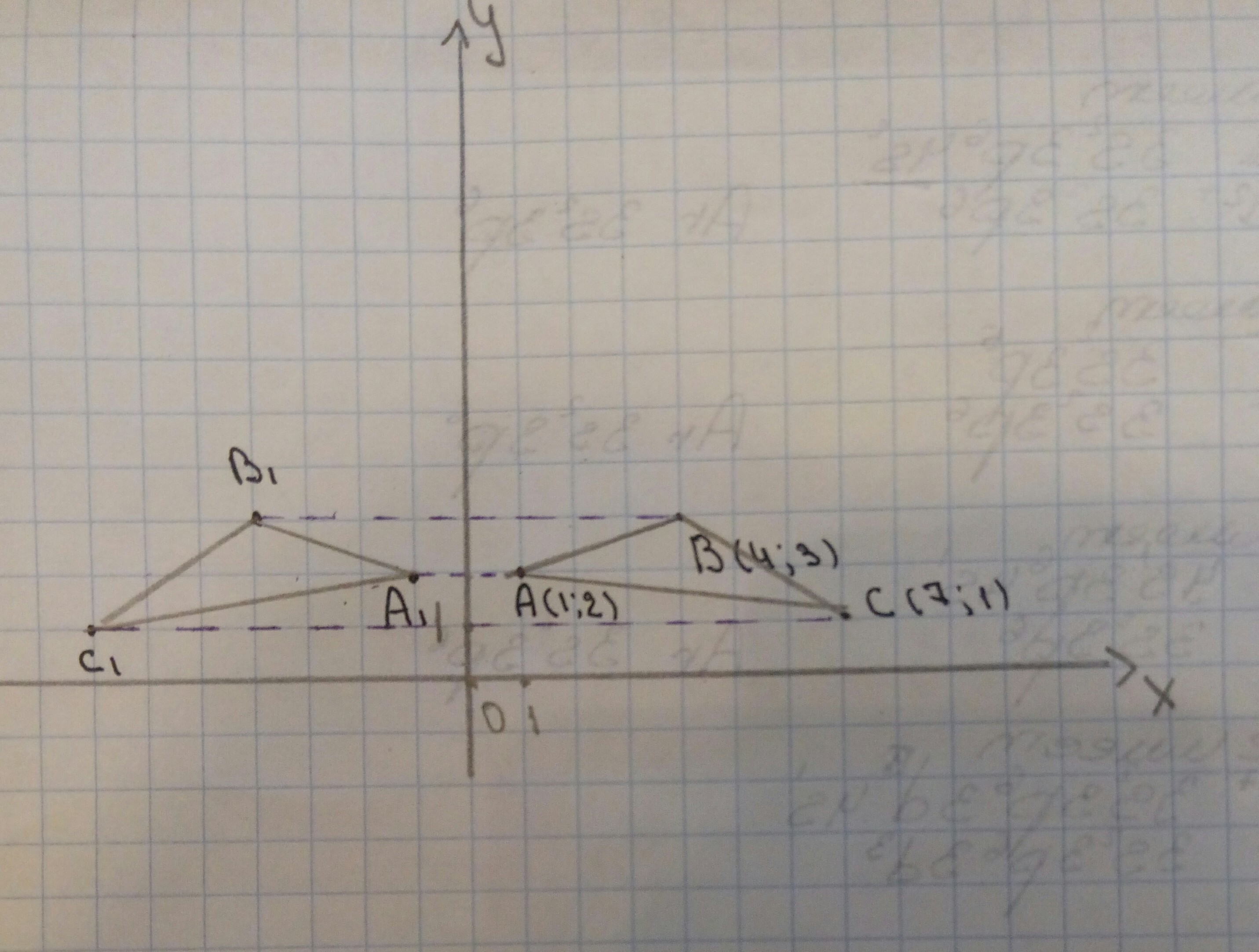 A(1;2), B(4;3), C(7;1) относительно оси ОУ А1; В1; С1.