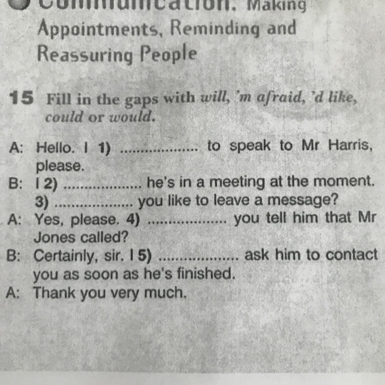 1 ‘d like 2 ‘m afraid 3 Would you 4 could 5 will