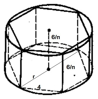 Вокруг прямой призмы, в основании которой лежит правильный шестиугольник со стороной 4, описан цилиндр. Найти объем цилиндра, если боковое ребро призмы равняется 6/π