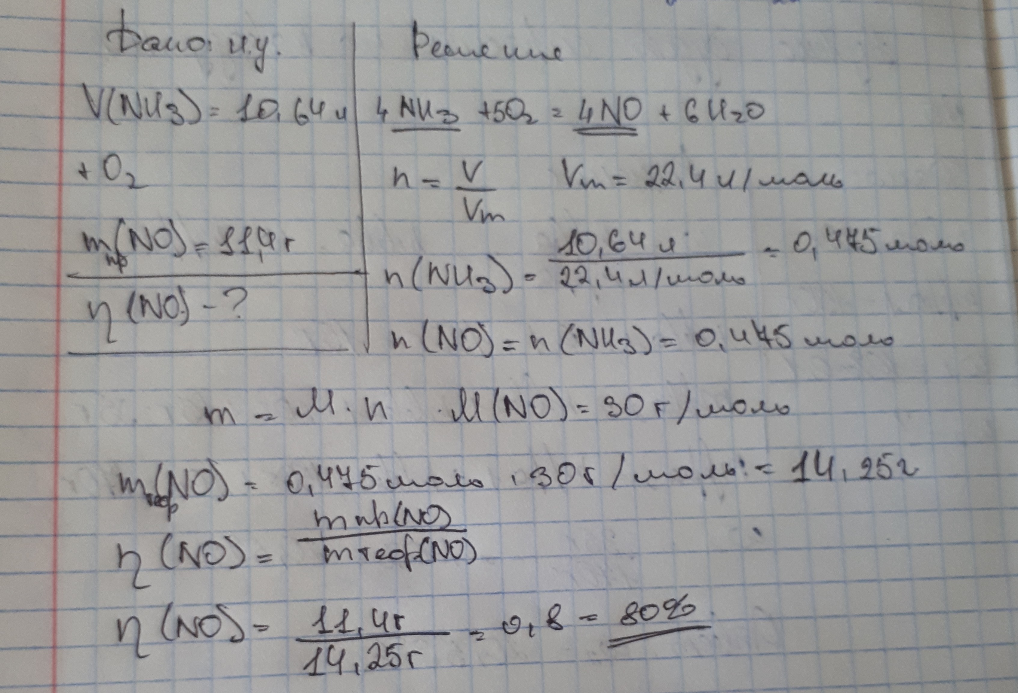 при взаимодействии амониака обьемом 10.64л (н.у) с кислородом в присутствии катализатора был получен нитроген (2) оксид массой 11.4г. Вычислите массовую часть выхода продукта от теоретично возможного (в процентах)