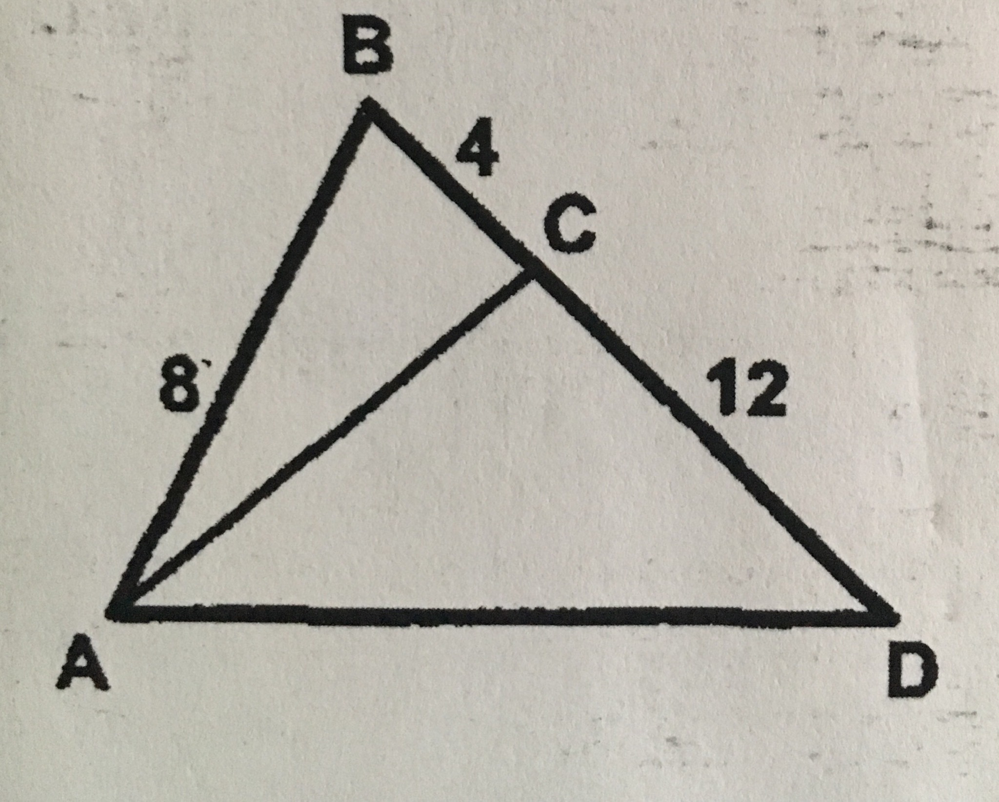 АВС и АВД по двум пропорциональным сторонам и углу между ними. Угол В общий АВ/ВС=ВД/АВ 8/4=16/8=2
