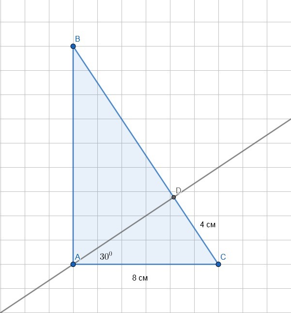 Рассмотрим треугольник ADC. Угол DAC=30 градусам. Катет лежащий против угла в 30 градусов в прямоугольном треугольнике равен половине гипотенузы. DC=4. Воспользуемся подобием треугольников ABC и ADC по трем сторонам