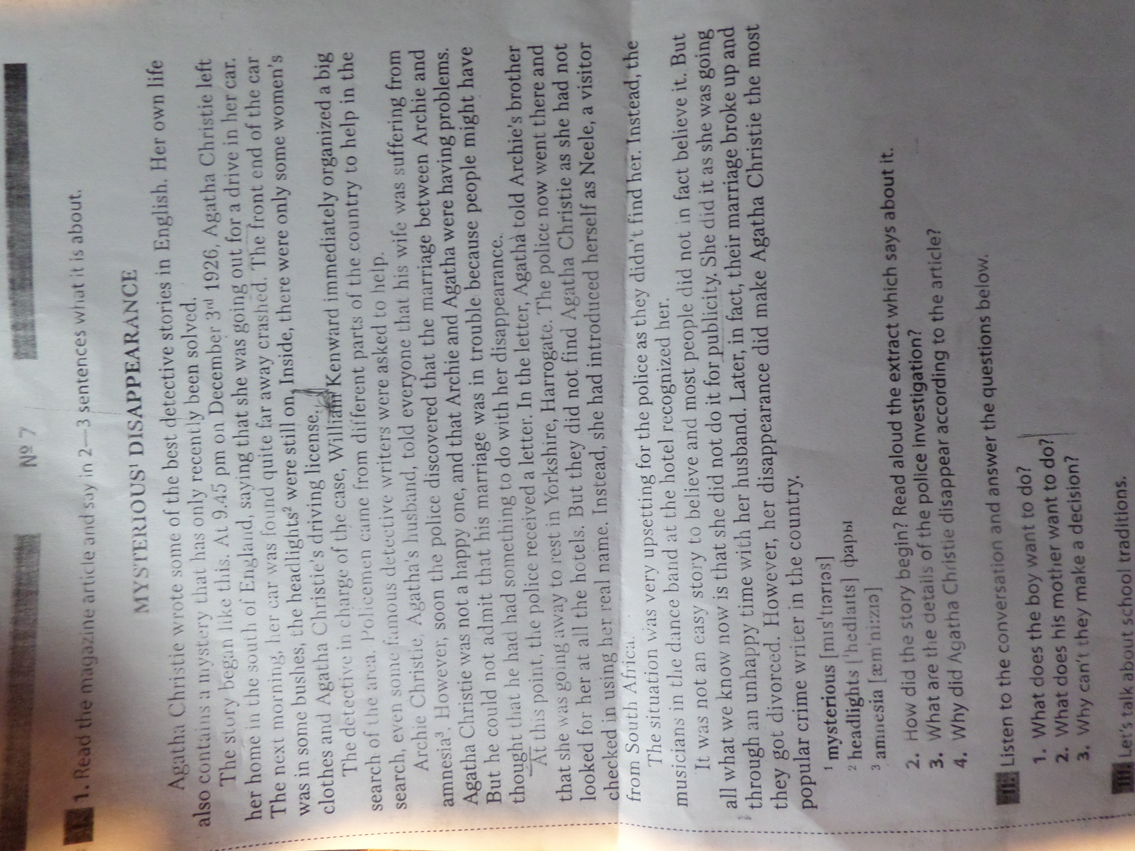 1. Прочитайте статью в журнале и скажите в 2-3 предложениях, о чем она. ТАИНСТВЕННЫЙ! Исчезновение Агата Кристи написала одни из лучших детективных историй на английском языке ее собственная жизнь также содержит тайну, которая только недавно была решена, история началась вот так. Премьер-министр 334 декабря 1926 года Агата Кристи покинула свой дом на юге Англии, заявив, что она едет на машине. На следующее утро ее машина была найдена довольно далеко разбился. Передняя часть автомобиля находилась в каких-то кустах, фары все еще были включены, внутри была только какая-то женская одежда и водительские права Агаты Кристи, детектив, отвечающий за дело, Уильям* Кенвард немедленно организовал большой обыск района. Полицейские приехали из разных уголков страны, чтобы помочь в поисках, даже некоторых известных детективов попросили помочь. Муж Арчи Кристи Агаты рассказал всем, что его жена страдает от амнезии, однако вскоре полиция обнаружила, что брак между Арчи и Агатой Кристи не был счастливым, и что у Арчи и Агаты были проблемы. Но он не мог признать, что его брак был в беде, потому что люди могут подумать, что он причастен к ее исчезновению. В этот момент полиция получила письмо в письме, Агата сказала брату Арчи, что она уезжает отдыхать в Йоркшир, Харрогейт. Полиция теперь пошла туда и искала ее во всех отелях. Но они не нашли Агату Кристи, поскольку она не зарегистрировалась, используя свое настоящее имя. Вместо этого она представилась Нилом, посетителем из Южной Африки. Ситуация была очень расстроена для полиции, так как они не нашли ее. Вместо этого музыканты танцевальной группы в отеле узнали ее. Это была непростая история, и большинство людей в нее не верили. Но все, что мы знаем сейчас, это то, что она сделала это не для рекламы. Она сделала это, когда переживала несчастливое время со своим мужем. Позже, фактически их брак распался и они развелись. Тем не менее, ее исчезновение сделало Агату Кристи самой популярной писательницей в стране таинственных (mis tiaras) фар hedlats) Amnesia am Ni: как началась история? Прочитайте вслух выдержку, которая говорит об этом. 3. Каковы детали полицейского расследования? 4. Почему Агата Кристи исчезла согласно статье? Слушайте разговор и отвечайте на вопросы ниже. 1. Что мальчик хочет сделать? 2. Что хочет сделать его мать? Почему они не могут принять решение? Давайте поговорим о школьных традициях.