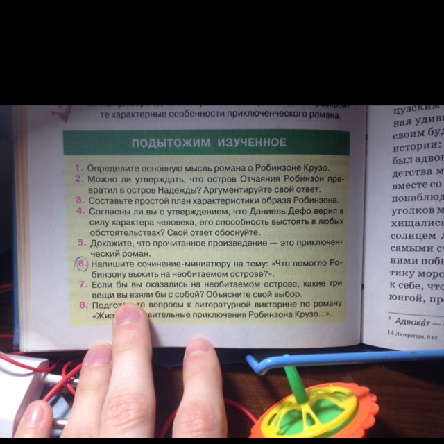 В-третьих, постоянный труд, который не давал ему опять же отвлечься на грустные думы. Робинзон строг по отношению к себе, не даёт себе ни минуты послабления. Он строит дом, разводит коз, ходит на охоту, рыбачит, обрабатывает землю, садит ячмень, шьёт себе одежду, обувь, лепит посуду, …