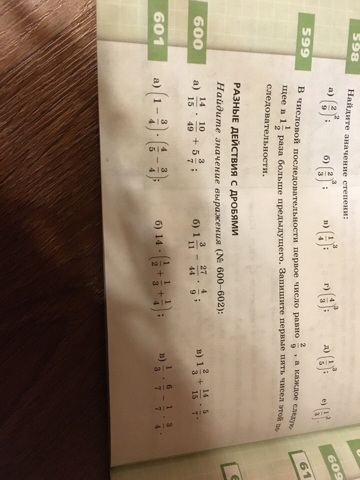 600а)14/15•10/49+5 3/7=2/3•2/7+38/7=4/21+38/7=118/21 б)1 3/11-27/44•4/9=14-3/11=11/11=1 в)1 2/3+14/15•5/7=5/3+2/3=7/3