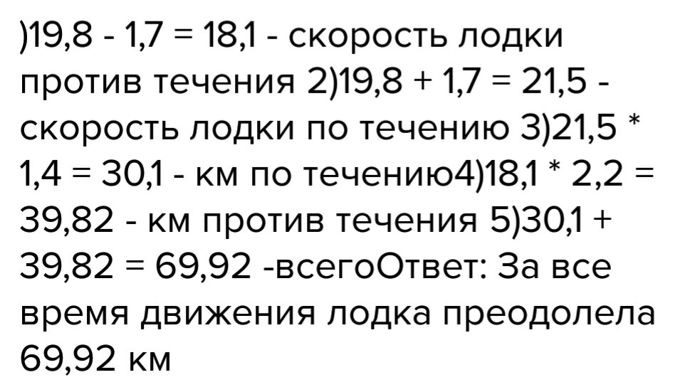 )19,8 - 1,7 = 18,1 - скорость лодки против течения 2)19,8 + 1,7 = 21,5 - скорость лодки по течению 3)21,5 * 1,4 = 30,1 - км по течению4)18,1 * 2,2 = 39,82 - км против течения 5)30,1 + 39,82 = 69,92 -всегоОтвет: За все время движения лодка преодолела 69,92 км
