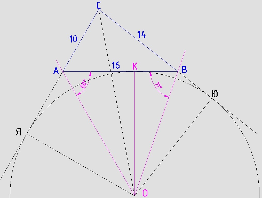 Стороны треугольника равны 10,14, 16. Найти отрезки на которые делит большую часть треугольника окружность, касающаяся этой стороны и продолжения двух других сторон