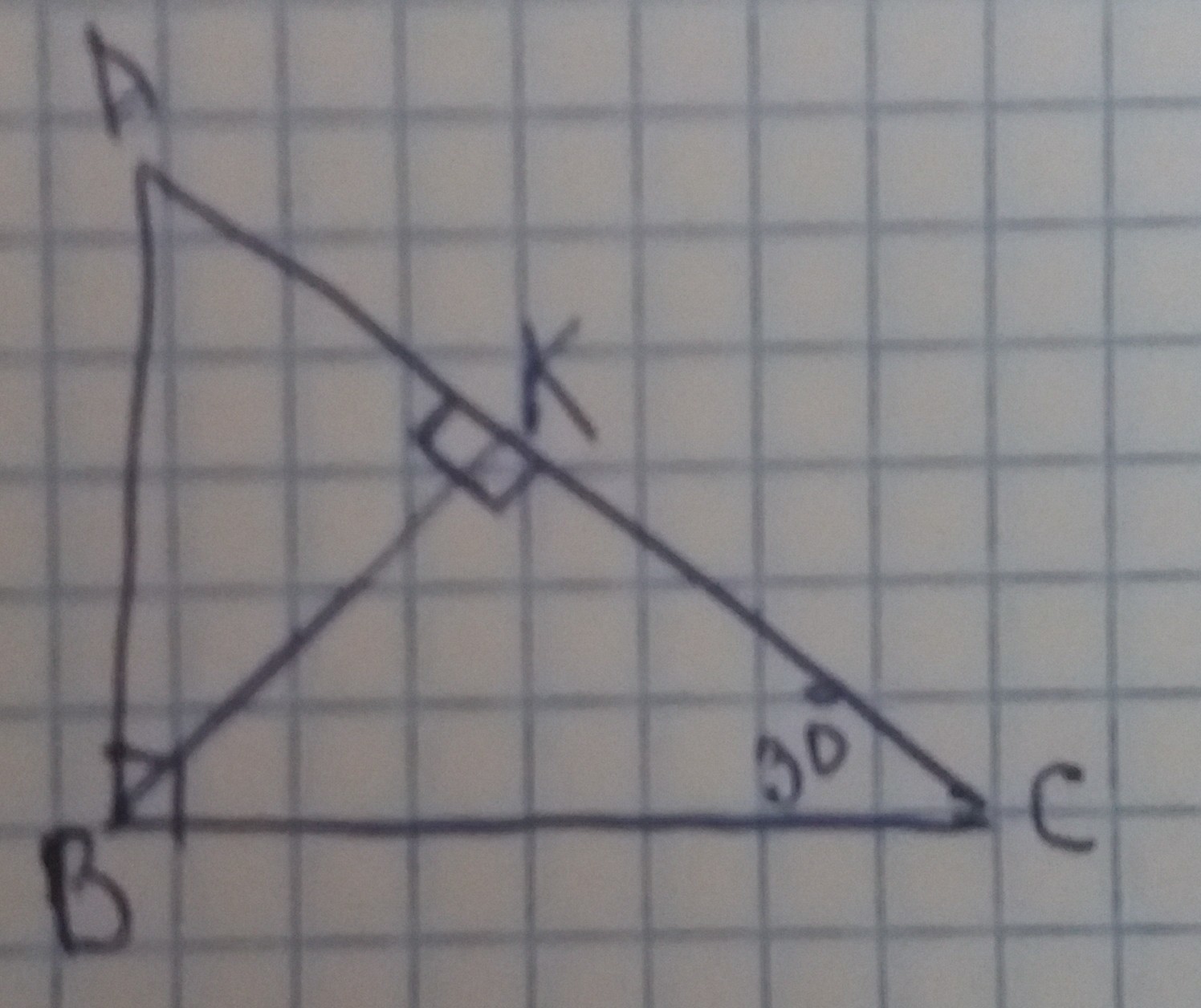 Так как катет лежащий напротив угла равного 30 градусов равен половине гиптенузы, то ВК=1/2ВС то есть, 36.2:2=18.1