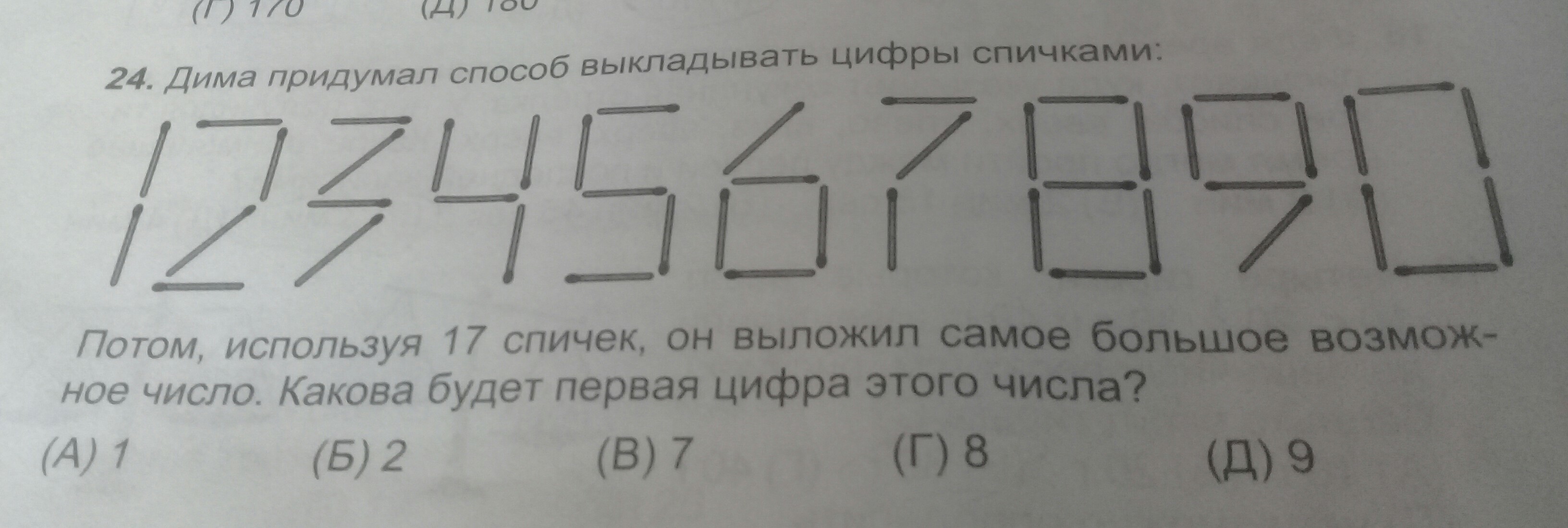 потом используя 17 спичек,он выложил самое большое возможное число.Какова будет первая цифра этого числа?