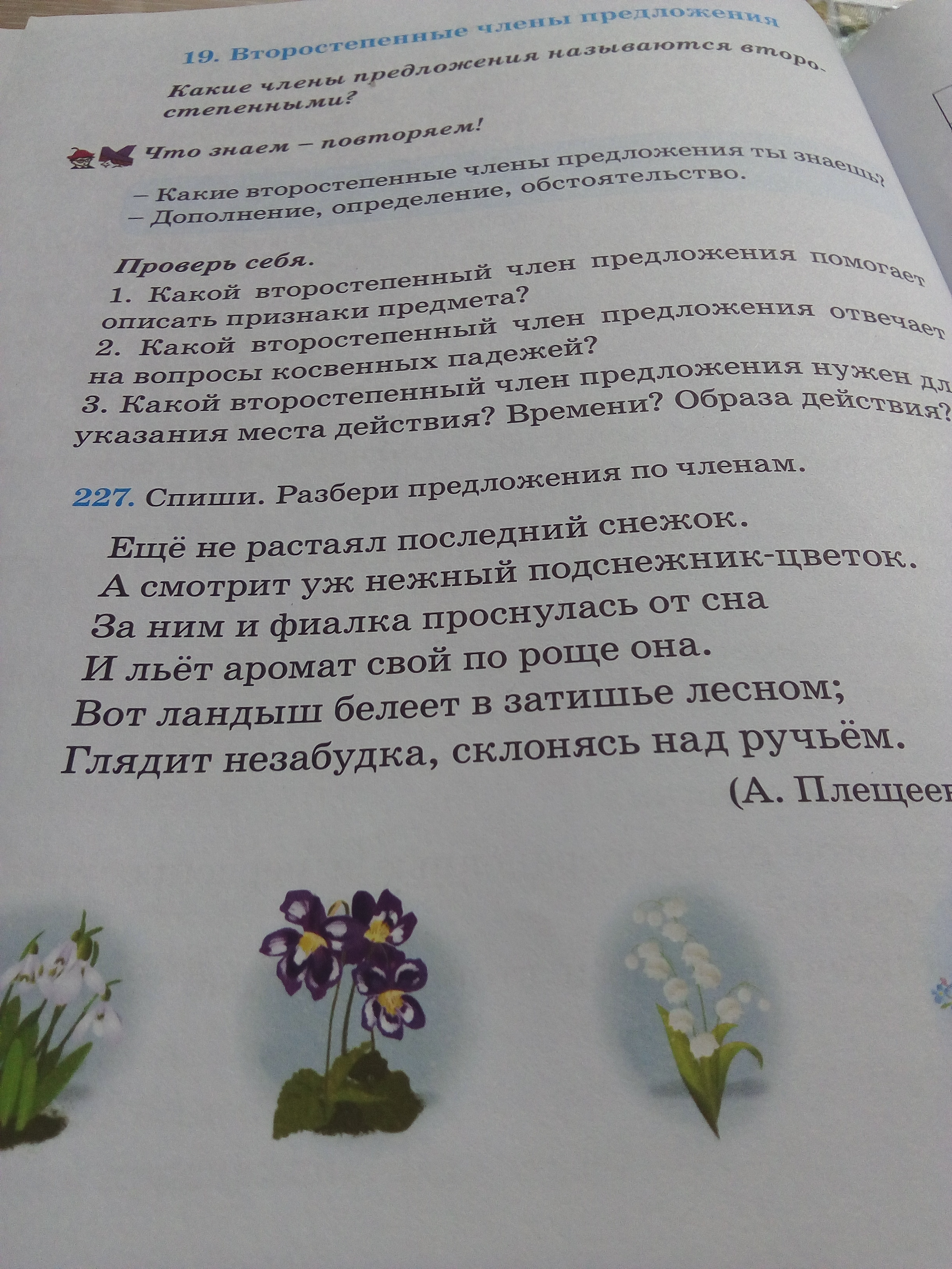 За ним(дополнение) и фиалка(подлежащее) проснулась(сказуемое) от сна(дополнение).