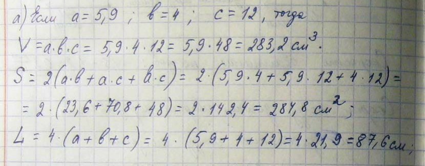 Длина прямоугольного параллелепипеда равна "а" см, ширина "б" см и высота "с" см. Найдите объем, площадь поверхности и сумму длин всех ребер этого параллелепида, если: