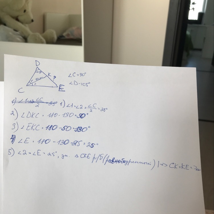 в треугольнике с д е угол С=50* УГОЛ Д=105* СК-биссектриса треугольника СДЕ , ск=7см найдите длину отрезка КЕ