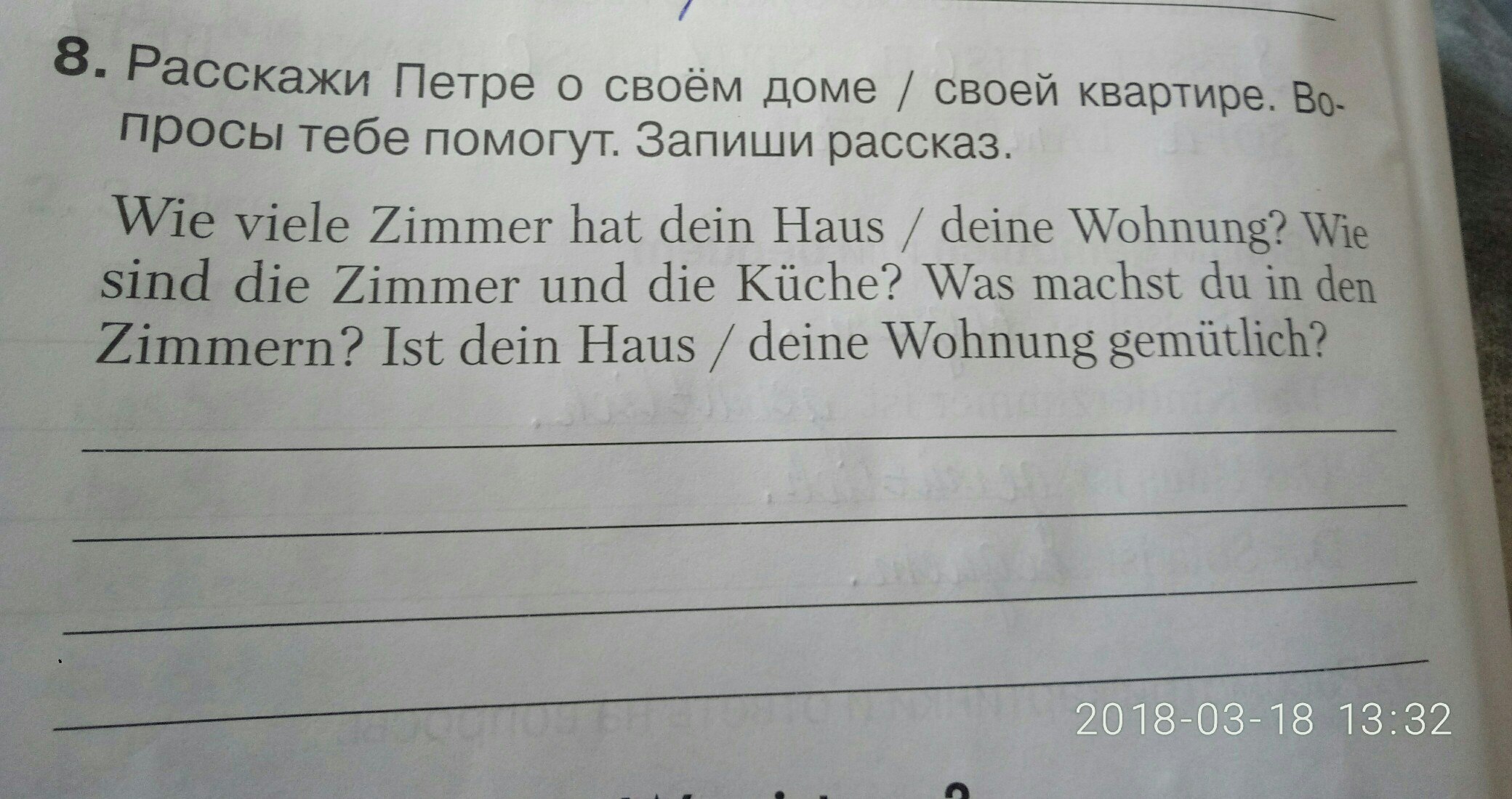 Ich will dir von unserer Wohnung erzählen. Unsere Wohnung liegt im dritten Stock und hat 3 Zimmer. Alle Zimmer und die Küche sind groß und hell. In den Zimmern muss ich aufräumen und die Blumen gießen. Im Wohnzimmer gibt es einen großen Fernseher. Abends sehe ich gern fern.