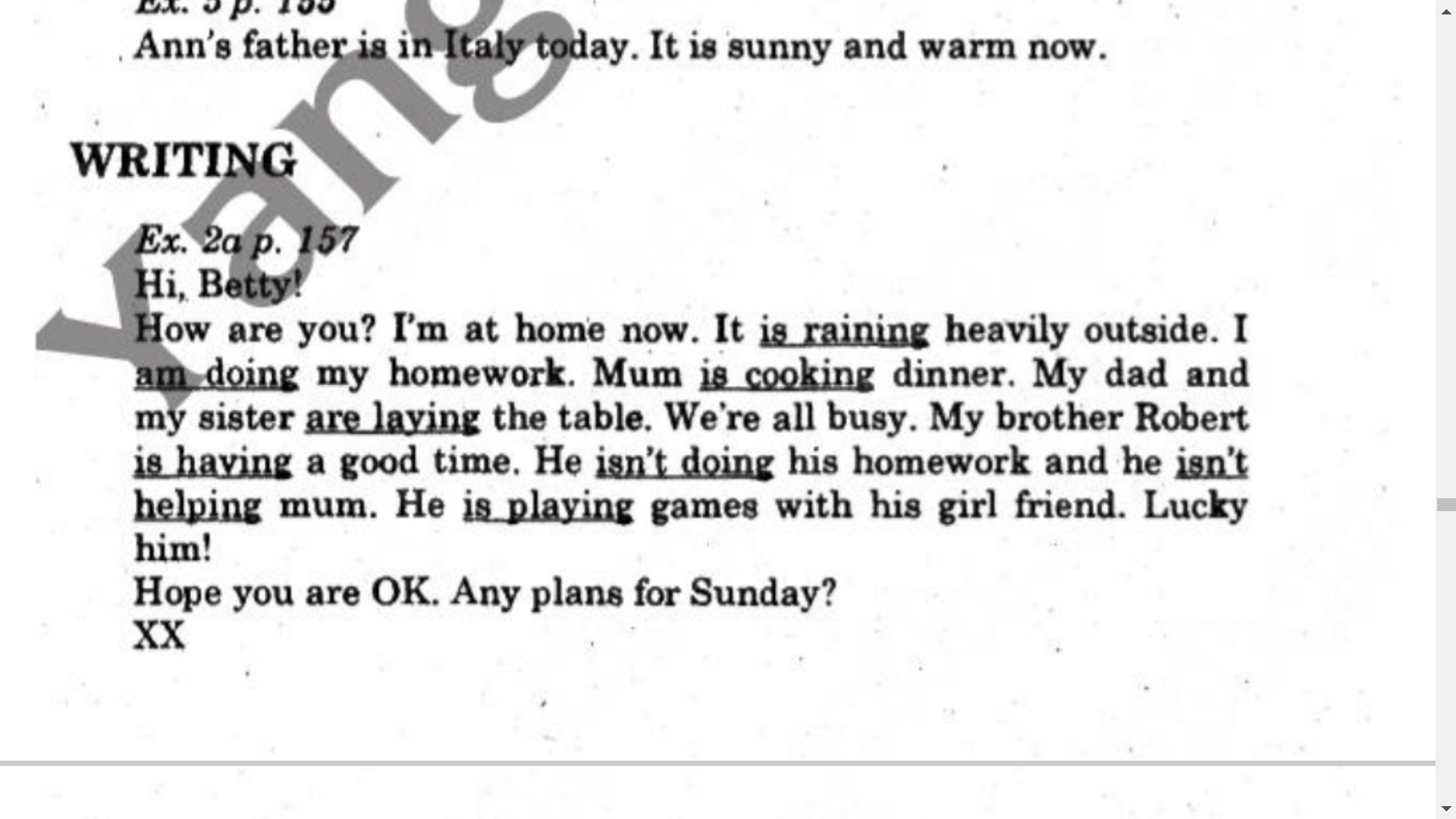 Как дела? Я сейчас дома. Идёт дождь. Я делаю домашнюю работу. Мама готовит обед. Мой папа и моя сестра сервируют стол. Мы все заняты. Мой брат Роберт хорошо проводит время. Он не делает домашнюю работу и не помогает маме. Он играет в игры со своей подругой. Счастливчик!