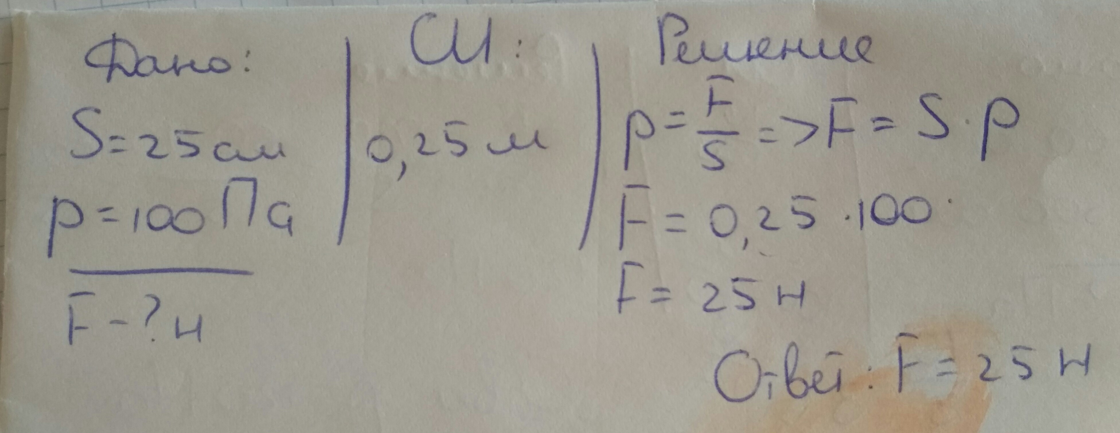 С КАКОЙ СИЛОЙ ВОЗДУХ ДЕЙСТВУЕТ НА ТЕЛА ПЛОЩАДЬЮ 25 СМ В КВАДРАТЕ ЕСЛИ АТМОСФЕРА ДАВЛЕНИЯ РАВНА 100 КИЛОМЕТРОВ ПАСКАЛЯ