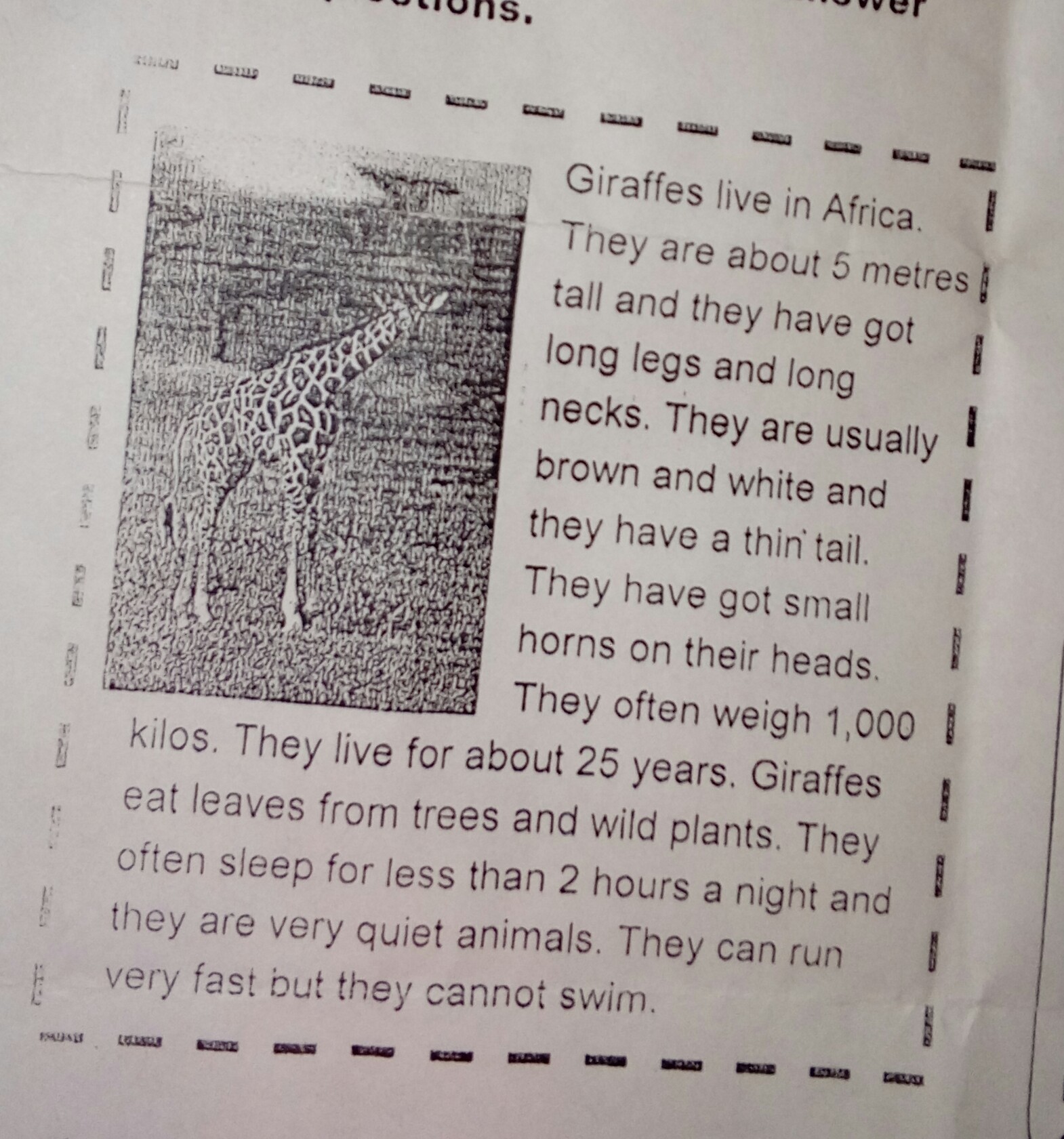 Жирафы живут в Африке. Их рост - 5 метров и у них длинные ноги и шея. Обычно они коричнево-белые и они имеют тонкий хвост. У них есть маленькие рожки на их головах. Они весят больше 1000 килограмм. Они живут примерно 25 лет. Жирафы едят листья с деревьев и диких растений. Они часто спят по 2 часа ночью и они очень тихие животные. Они могут быстро бегать, но не умеют плавать.
