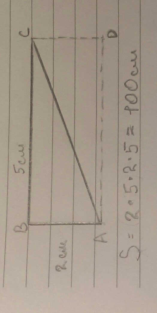 Начерти в тетради треугольник АВС так, чтобы угол АСВ БЫЛ прямым длина стороны равна 2см, а длина стороны СВ была равна 5см. Дострой этот треугольник до прямоугольника и вычесли его площадь и в дополнения выложи фото