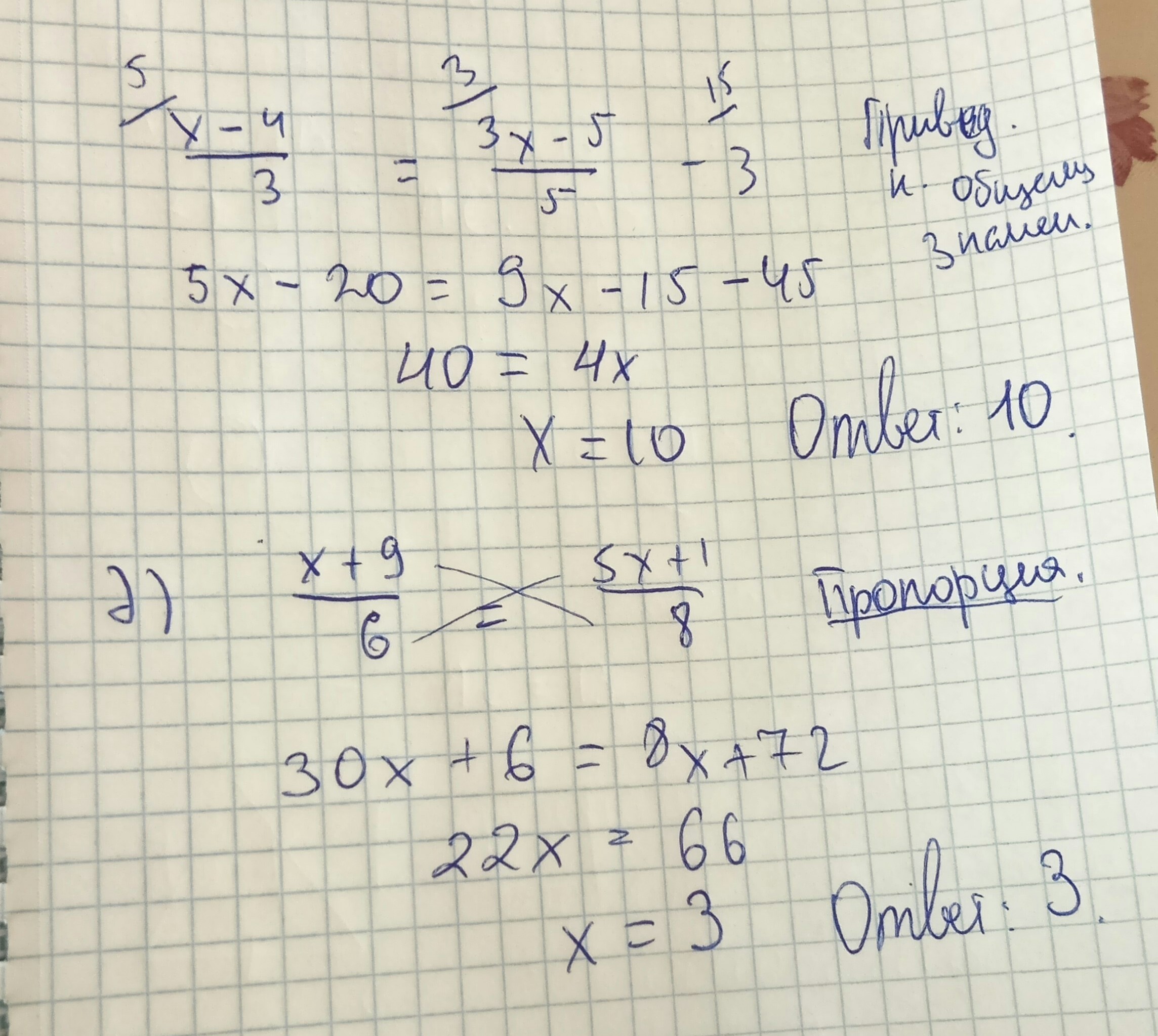 решение на фотографии. в первом случае мы приводим все к общему знаменателю, во втором делаем как пропорцию (перемножаем крест накрест)