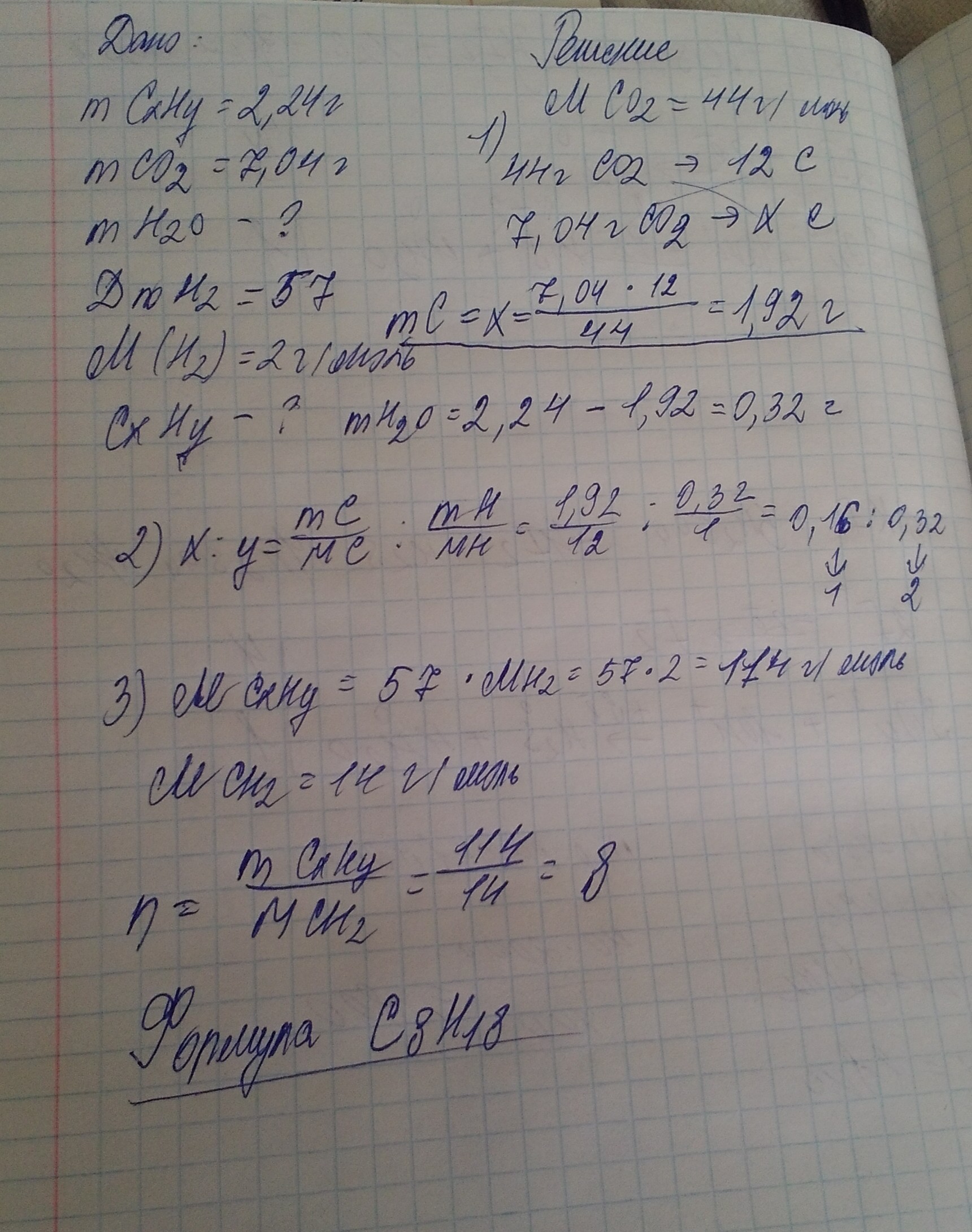 При сжигании 2.24 г углеводорода образовалось 7.04 г оксида углерода(IV). Относительная плотность паров этого вещества по водороду равно 57. Выведите молекулярную формулу этого углеводорода.