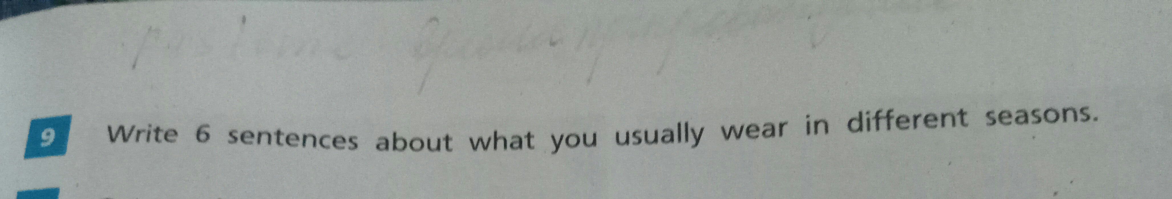 In summer I usually wear a dress, hat and snickers. Also sometimes in summer I wear T-shirt and shorts. In winter I usually wear a warm jacket, jeans, sweater and shoes. In autumn I usually wear a warm jeans and sweater. In spring I always wear a dresses with waistcoat and tights. Also in winter I wear a big scarf.