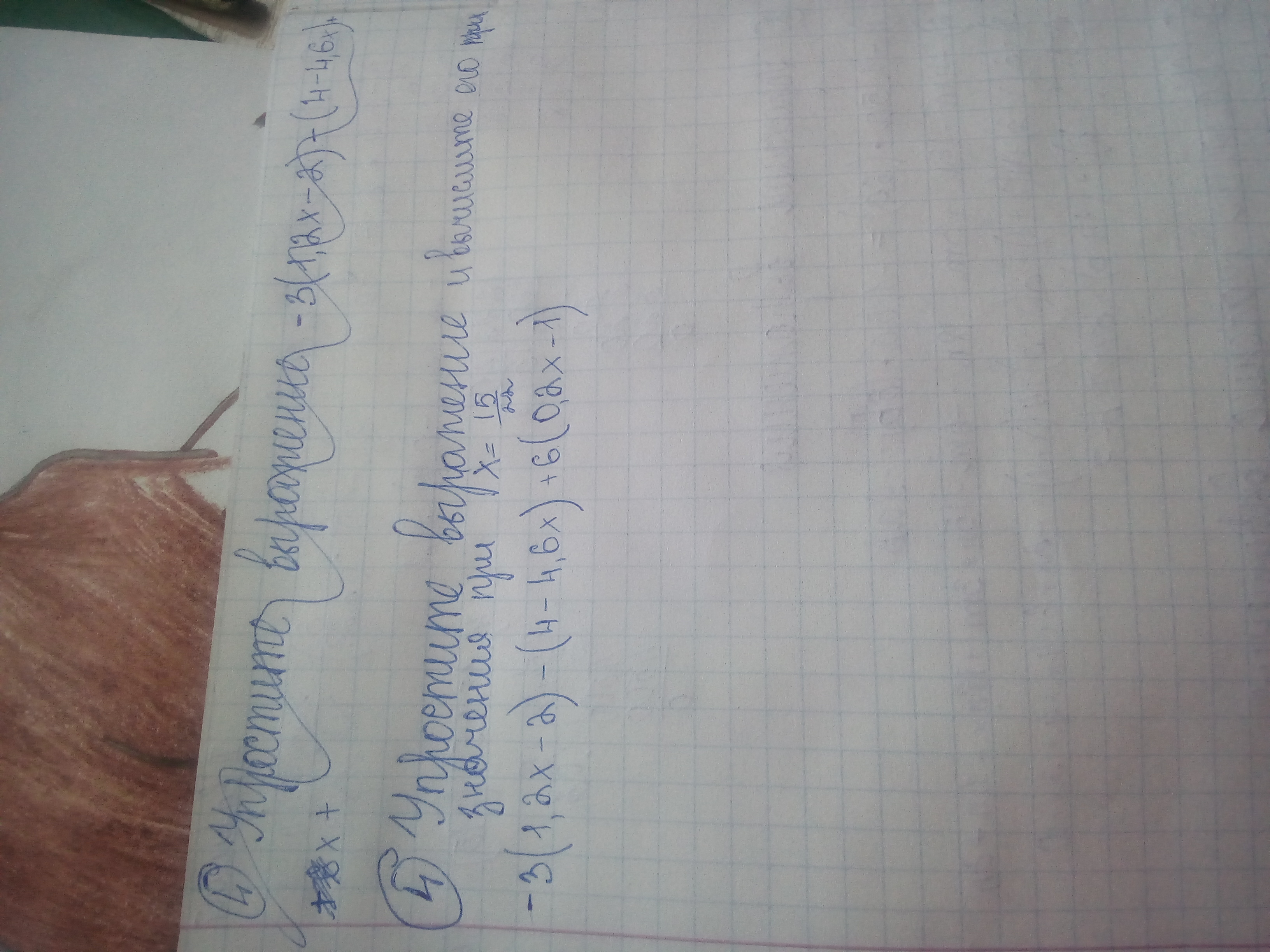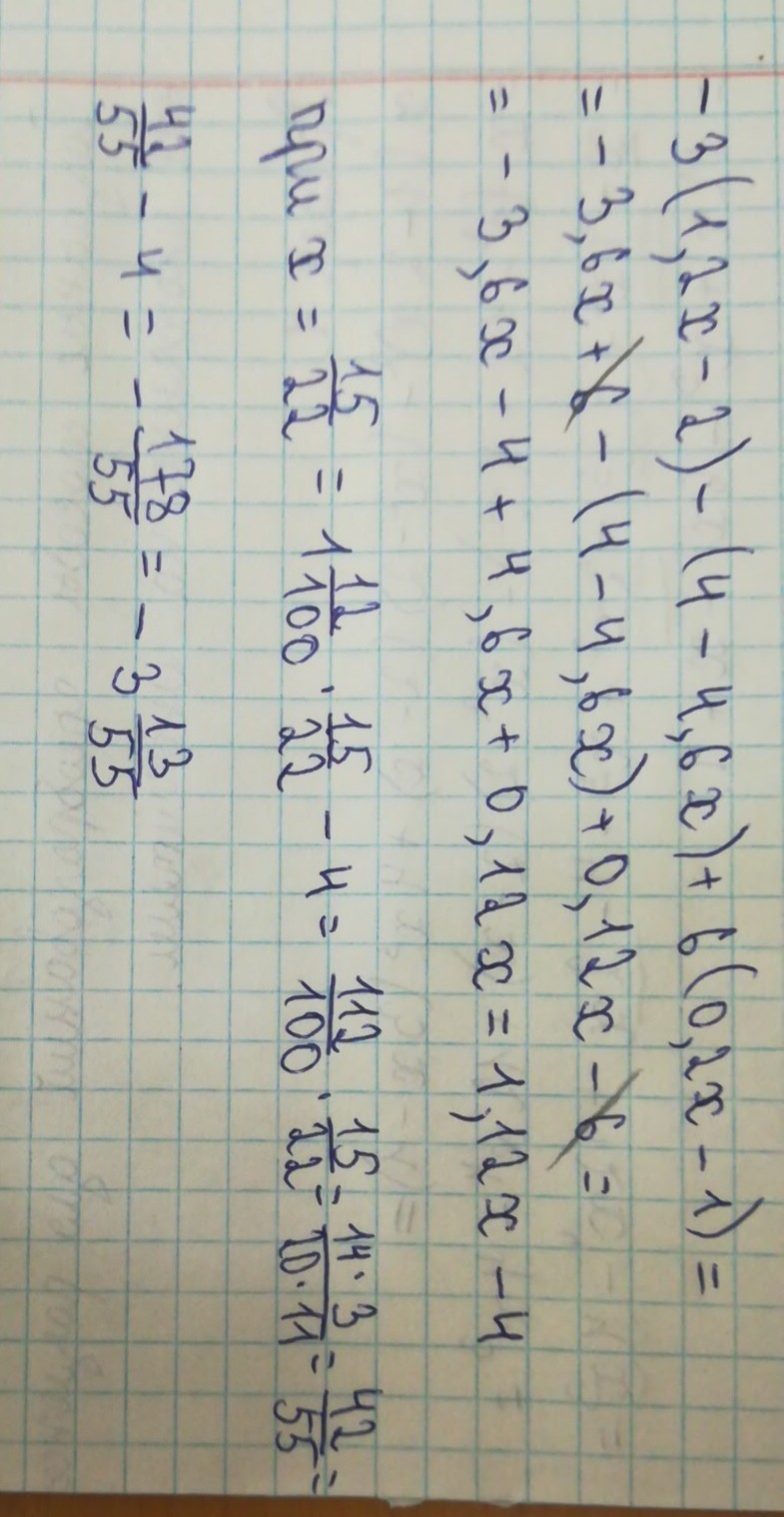 упростите выражение и вычеслите его значение при х=15/22(дробь) -3(1.2х-2)-(4-4.6х)+6(0.2х-1)