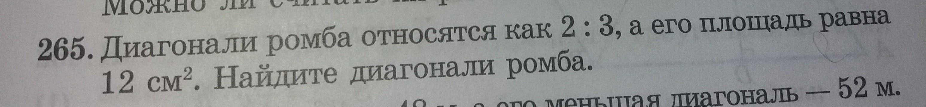 Диагонали ромба относятся как 2:3, а его площадь равна 12 см^2. Найдите диагонали ромба.