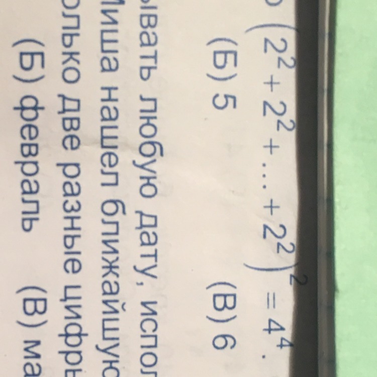 Известно, что (2 во 2 степени+2 во 2 степени+.....+2 во 2 степени)2=4 в 4 степени. Сколько слагаемых в скобке? А) 4 Б) 5 В) 6 Г) 7 Д) 8