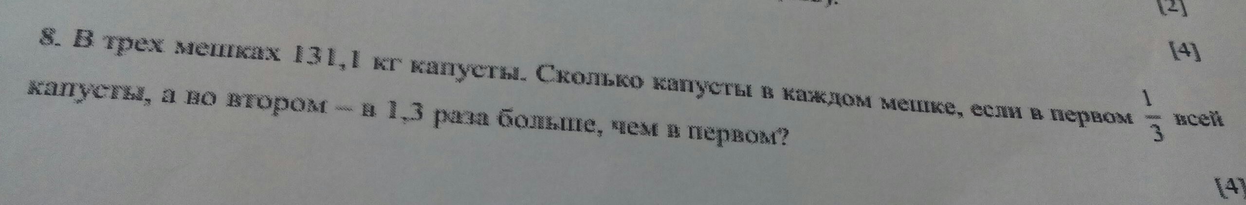 131,1 : 3 = 43,7 (кг) -капусты в первом мешке.