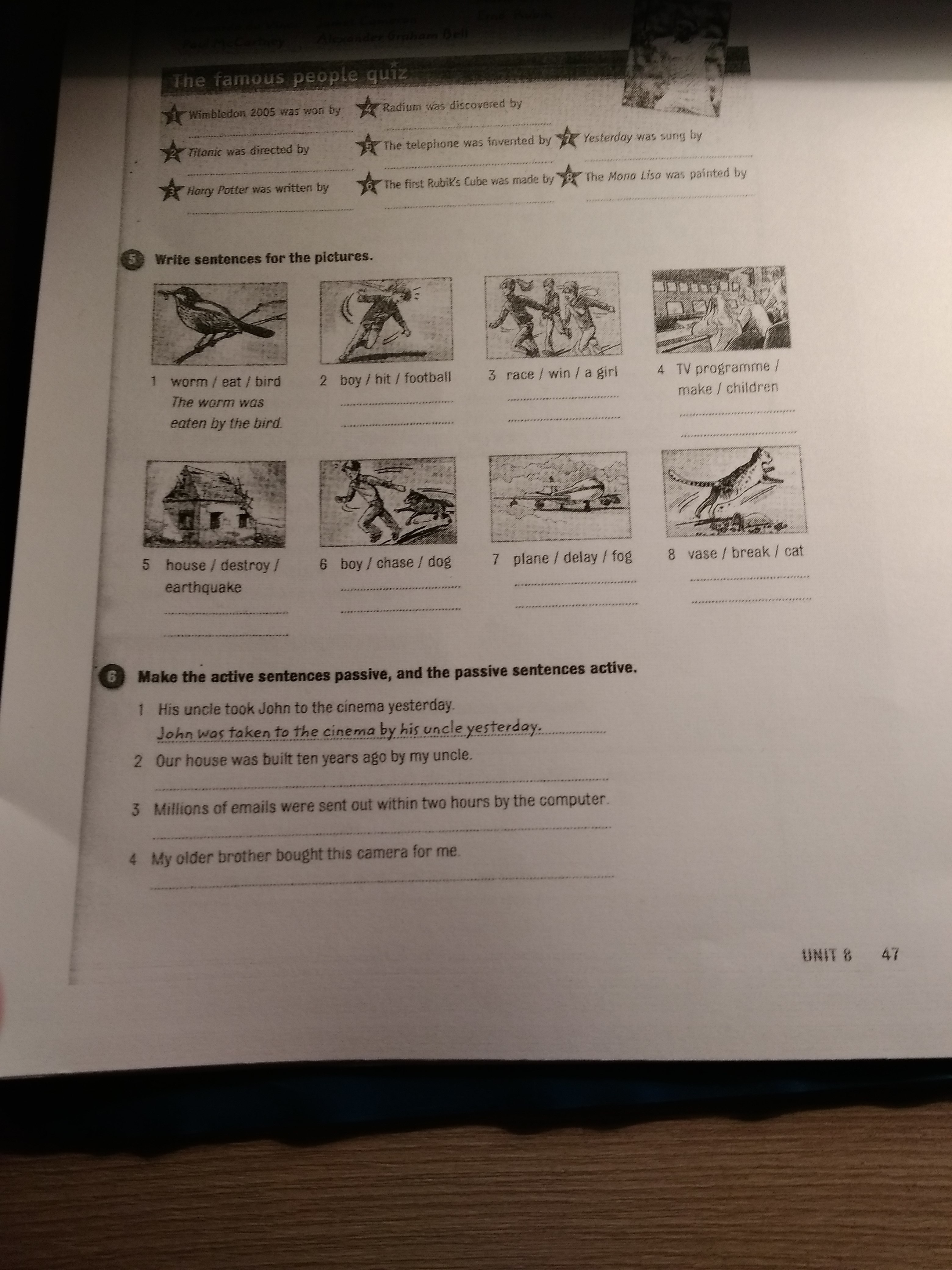 Football was hit by the boy.The race was won by a girl.TV programme was made by children.The house was destroyed by the earthquake.The boy was chased by the dog.The plane was delayed by fog.The vase was broken by the cat.