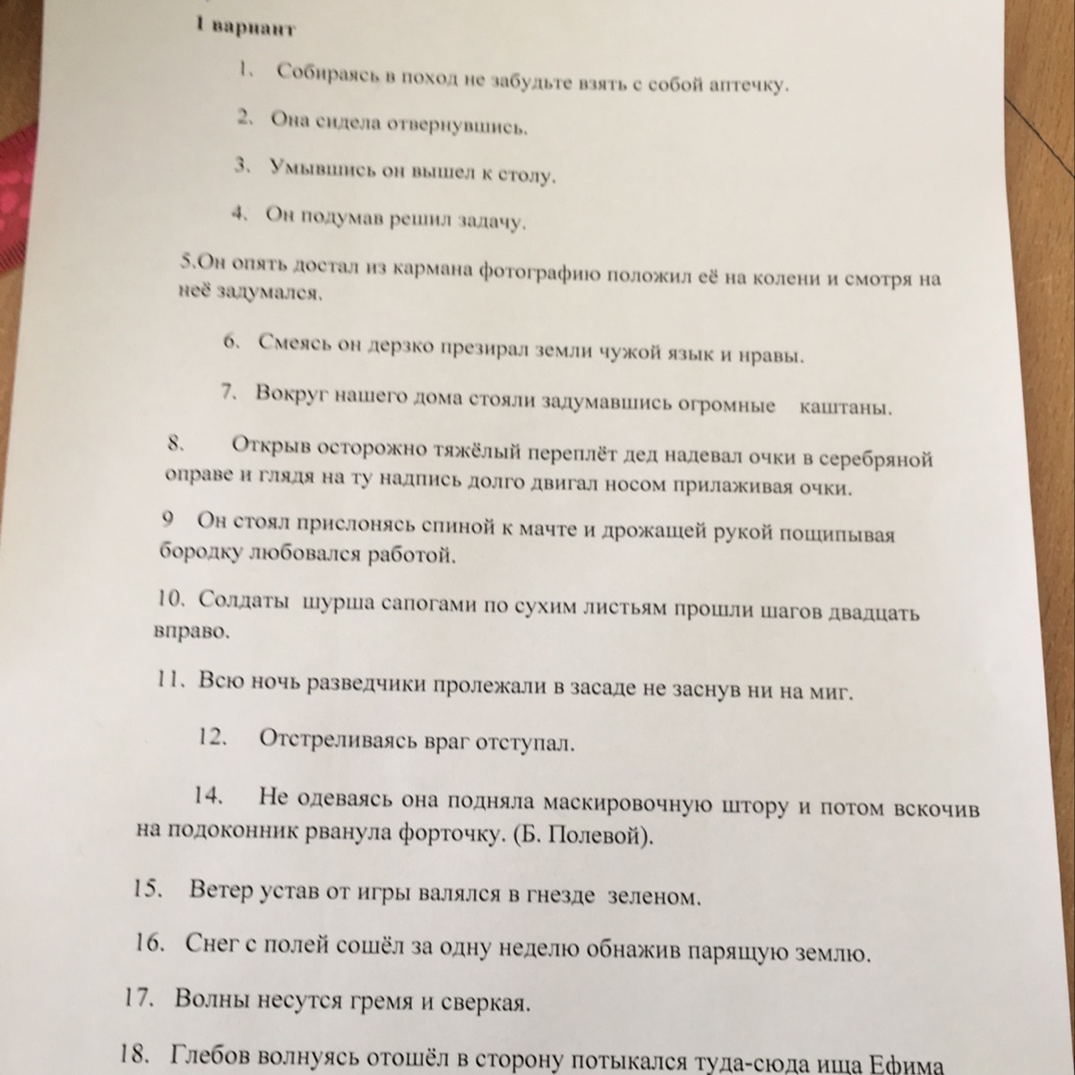 5.Он опять достал из кармана фотографию, положил ее на колени и, /смотря на неё/, задумался (деепричастный оборот)