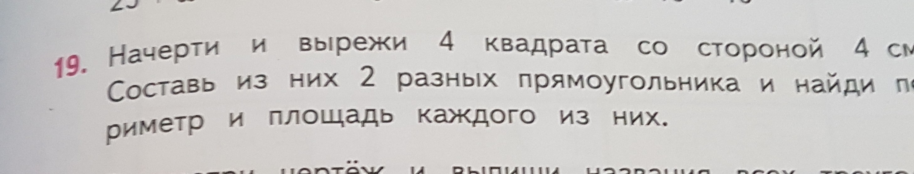 Начерти и Вырежи 4 квадрата со стороны 14 см составь из них два разных прямоугольника и Найди периметр и площадь каждого из них