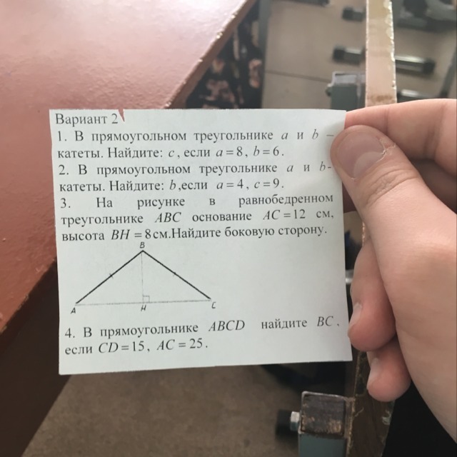 4)(полностью, не уверен, что правильно) BC - диагональ, чертим диагональ BC в прямоугольнике и получаем два равных прямоугольных треугольника: ABC и CBD, берем треугольник ABC, AC = 25 cm, AB = CD = 15 cm, по теореме Пифагора находим третью сторону. BC² = AC² + AB², BC² = 625 + 225 = 850 см. BC = 5√34 см